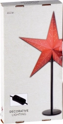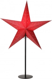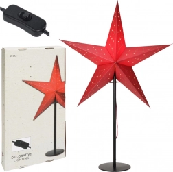 Stijlvolle tafellamp in de vorm van een kerstster in 3D-uitvoering die het interieur een feestelijke sfeer en gezellig licht geeft. De robuuste ster van stevig karton in het rood op een zwarte metalen standaard is 70 cm hoog en de diameter van de ster is 45 cm. Voorzien van netvoeding, 1,9 m kabel en schakelaar. Geschikt voor een E14-lamp (niet inbegrepen).