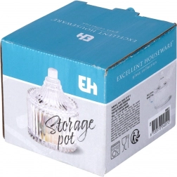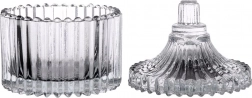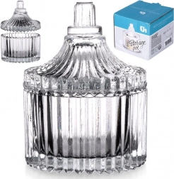 Stijlvol glazen suikerschaaltje met deksel in compacte afmetingen van 6,5 × 9 cm en een inhoud van 80 ml, een uitstekende keuze voor dagelijks gebruik en feestelijke gelegenheden. Het geribbelde decor voegt een vleugje vintage elegantie toe en het transparante glas maakt controle van de inhoud eenvoudig.