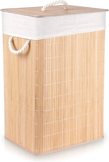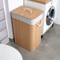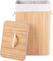 Stijlvolle en ruime bamboe wasmand met een inhoud van 70 l en twee compartimenten voor eenvoudig sorteren van was. Heeft een stabiele constructie, een afneembare deksel tegen geurtjes en een linnen uitneembare voering voor gemakkelijk reinigen. Praktische touwhandgrepen zorgen voor eenvoudig dragen. Ideale toevoeging aan badkamer of wasruimte in natuurlijke stijl.