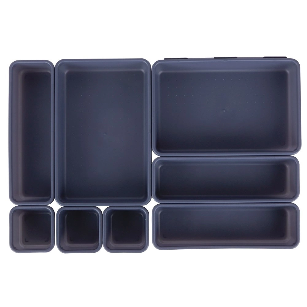 Houd orde in elke lade met de set van 8 modulaire organizers in grafietkleur. Combineer bakjes van verschillende formaten, creëer elke gewenste indeling en heb alles altijd binnen handbereik. Licht en duurzaam plastic, 3 praktische formaten, eenvoudig te reinigen en ruimtebesparend in elkaar te schuiven maken deze set ideaal voor kantoor, badkamer en kledingkast.