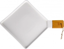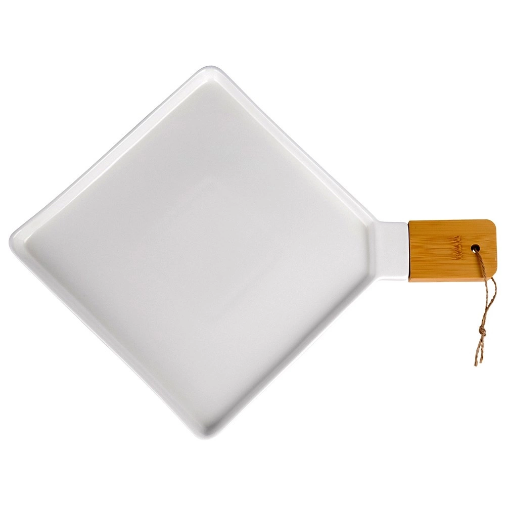 Elegante serveerschaal van hoogwaardig porselein met een bamboe handgreep voor eenvoudig dragen. Ideaal voor het stijlvol serveren van voorgerechten, hoofdgerechten en desserts. Duurzame uitvoering in tijdloos wit, perfect voor zowel thuisgebruik als horeca. Dankzij de praktische uitsparing met koord kun je de schaal ophangen en altijd binnen handbereik hebben.