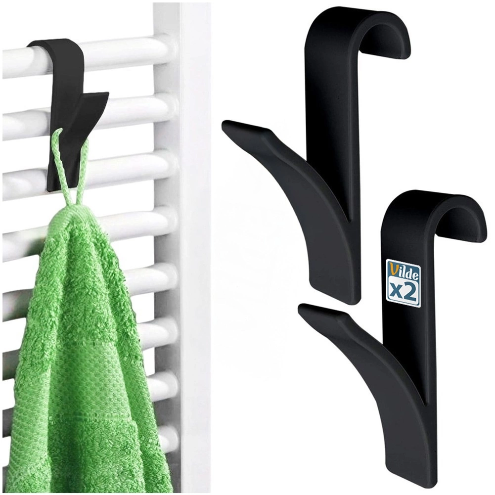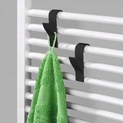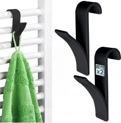 Praktische set van twee radiatorhaken voor snel drogen en ruimtebesparing. Je hangt ze eenvoudig op zonder te boren; ze zijn van duurzaam kunststof in het zwart en passen op de meeste leden- en plaatradiatoren, deuren of kastdeurtjes. Ideaal voor handdoeken, badjassen, pyjama’s en keukenhanddoeken – het elegante, minimalistische design past in elke badkamer, keuken en hal.