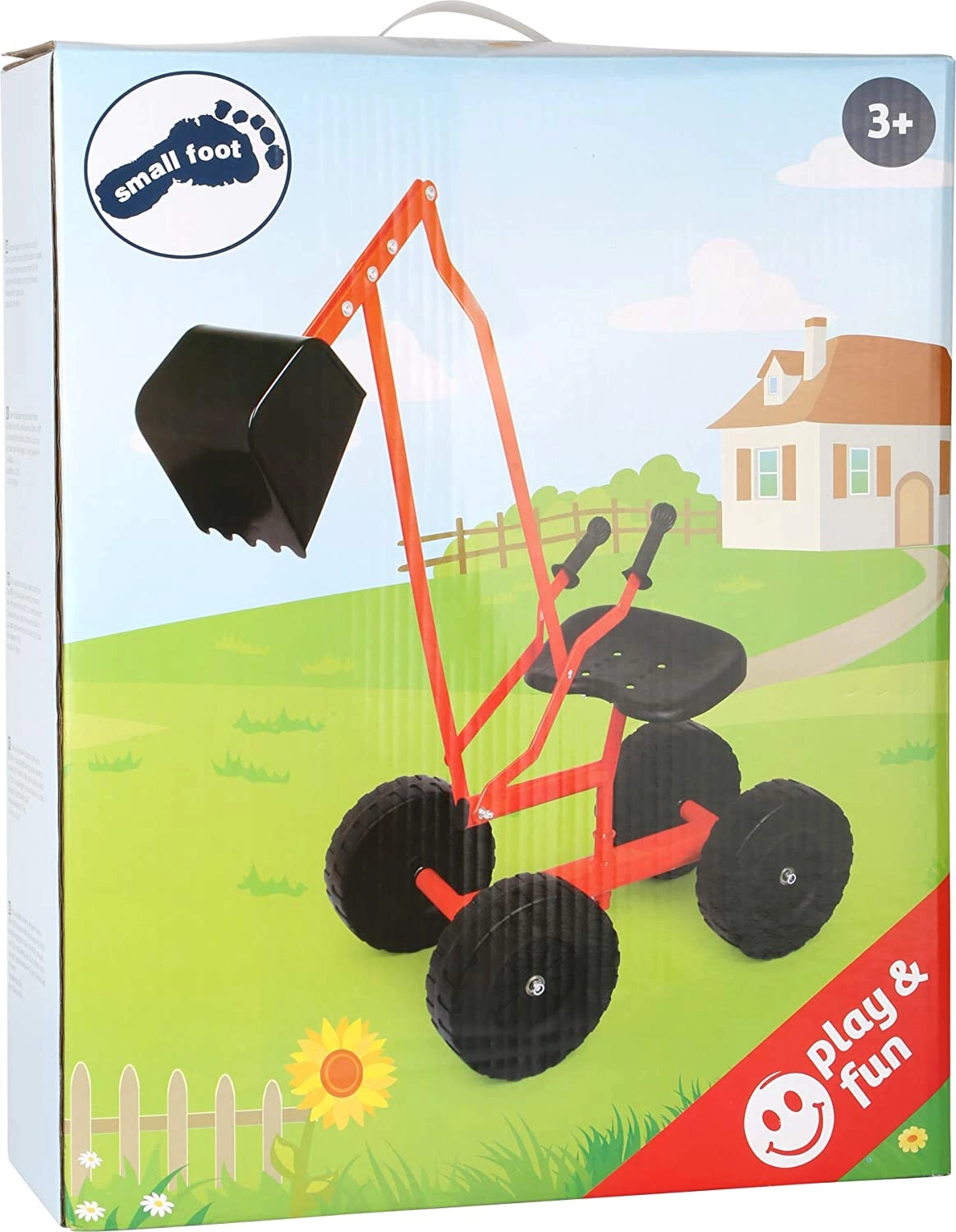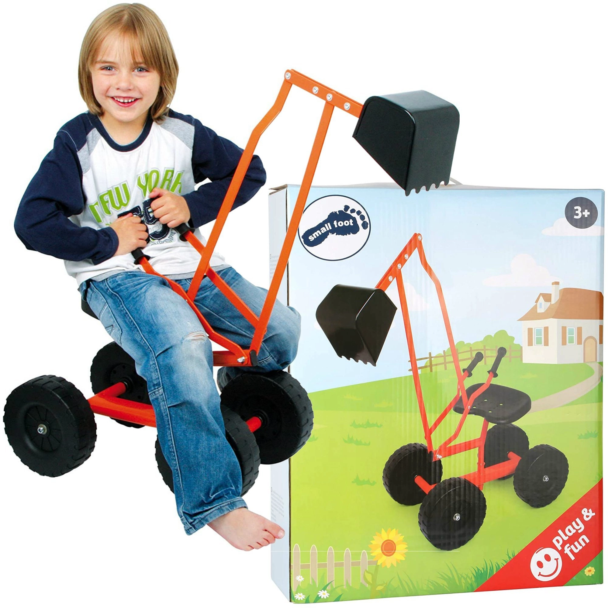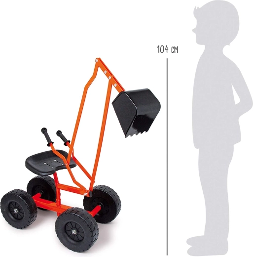 Robuuste kindergraafmachine van het merk Small Foot voor buitenspeelplezier in de zandbak en in de tuin. Voorzien van een metalen frame, grote wielen voor stabiliteit, een 360° draaibare schep en een comfortabel zitje met hendelbediening van de arm.