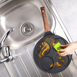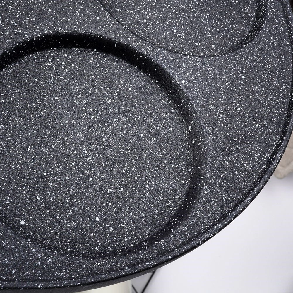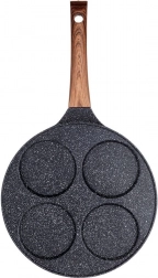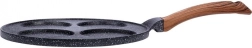 Stijlvolle pan uit de BLACK&WOOD-lijn in de populaire combinatie van zwarte steenlook en hout, maakt het bereiden van eieren, poffertjes en mini pancakes eenvoudig. Vier toegewezen uitsparingen helpen de ideale vorm en grootte te behouden, terwijl het aluminium lichaam met gelijkmatige warmteverdeling de kooktijd verkort en energie bespaart.