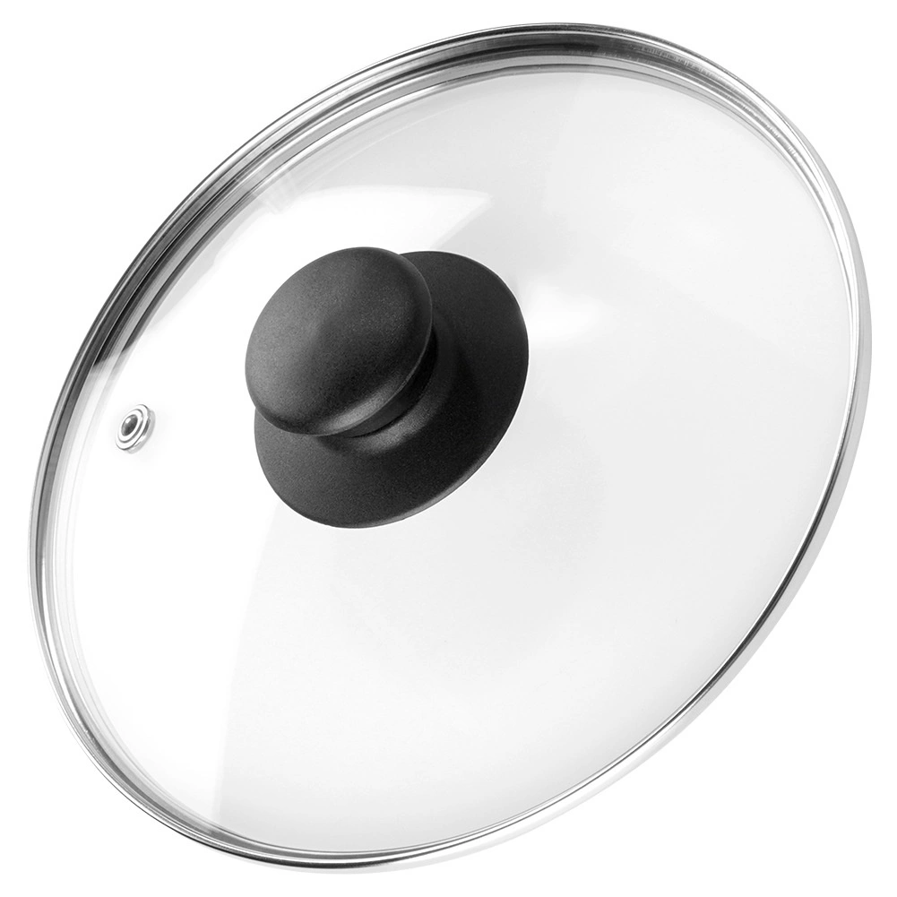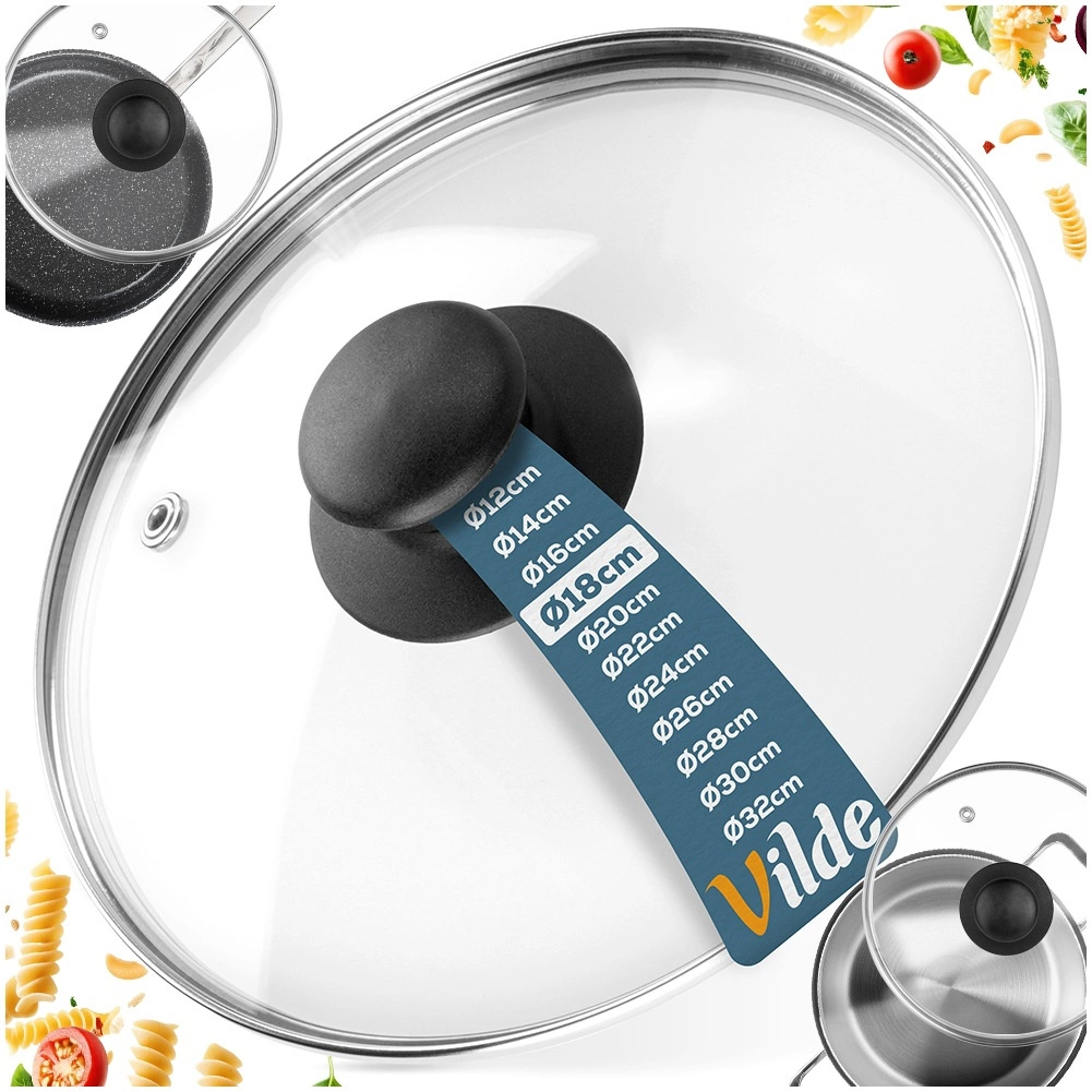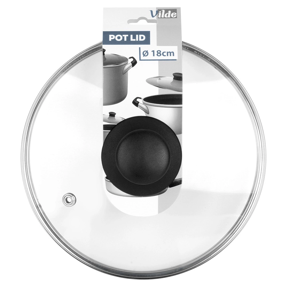 Universeel glazen deksel met een diameter van 18 cm, voorzien van een roestvrijstalen rand en comfortabele greep. Dankzij het transparante glas houd je het kookproces voortdurend in de gaten, de stoomafvoeropening voorkomt overkoken en de hogere rand zorgt voor een nauwe afsluiting op potten en pannen. Hittebestendig tot 200 °C en vaatwasserbestendig.