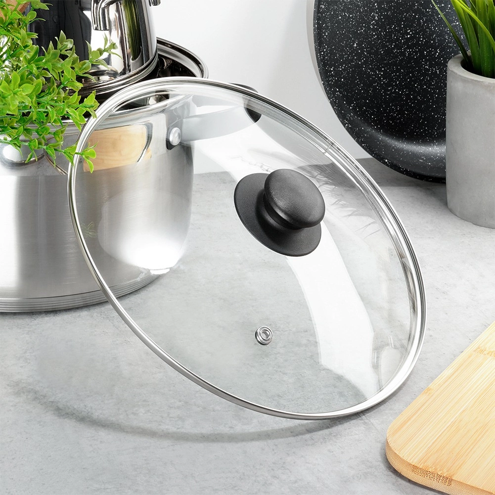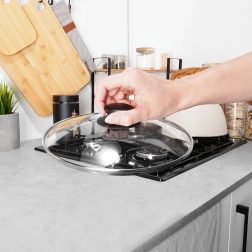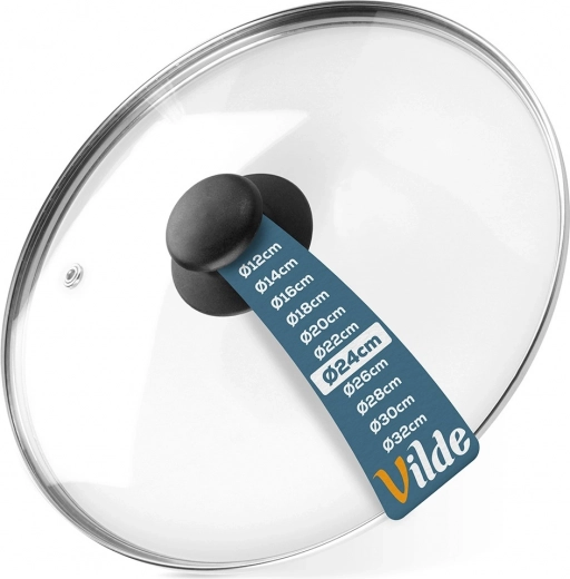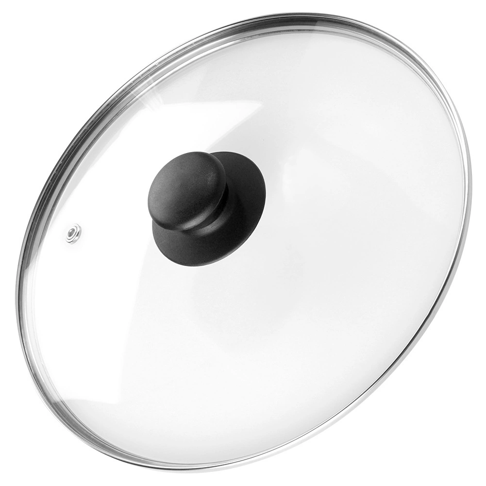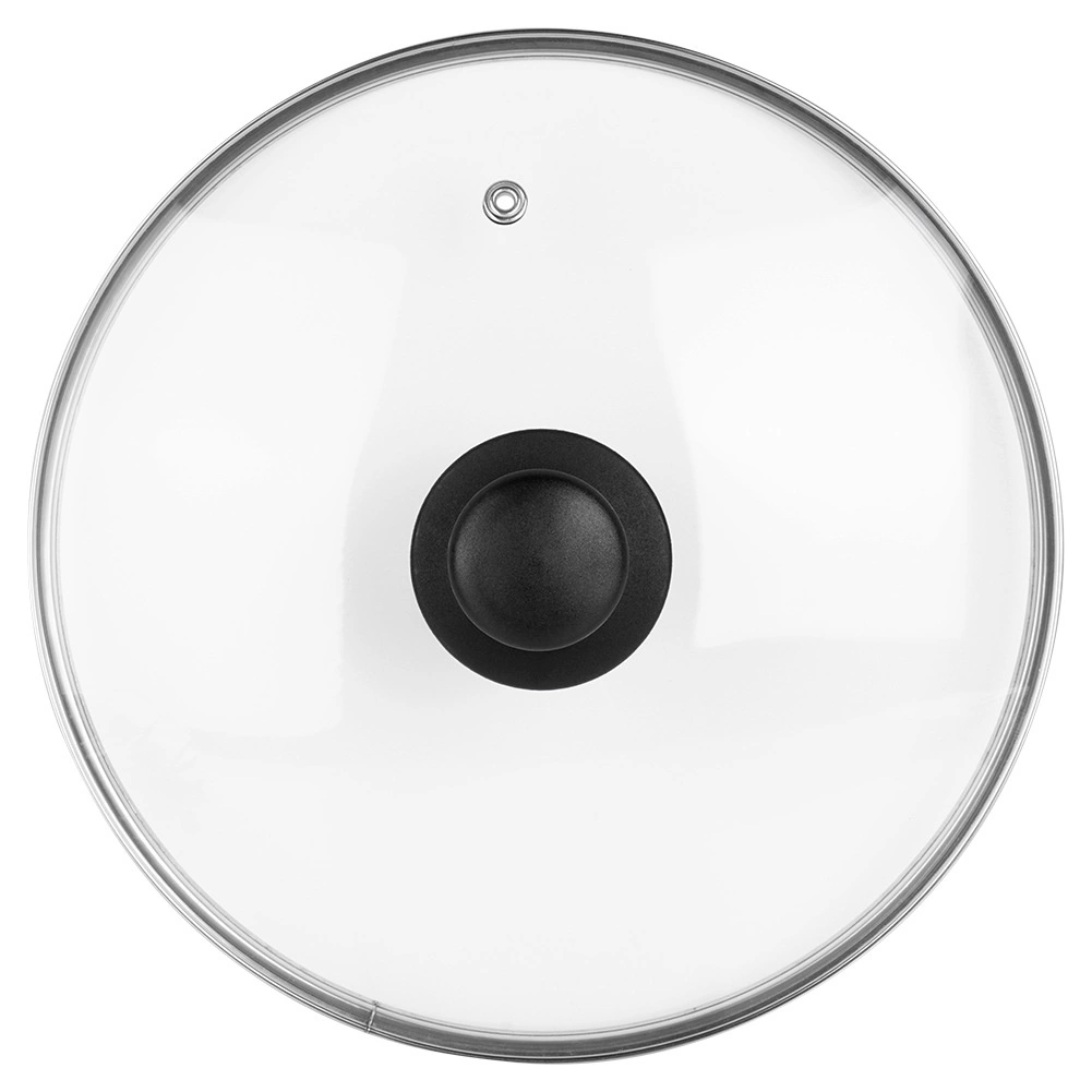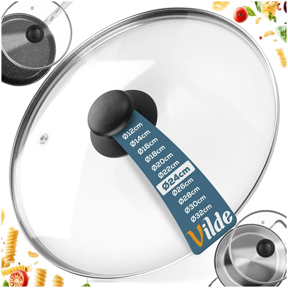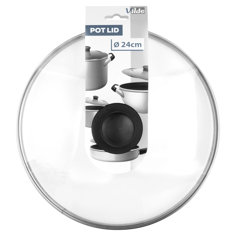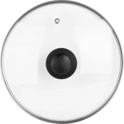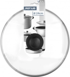 Universeel glazen deksel met een diameter van 24 cm, voorzien van hittebestendig glas, een roestvrijstalen rand en een comfortabele greep. Dankzij het transparante glas houd je het kookproces in de gaten zonder het deksel op te tillen, terwijl de stoomontlastingsopening overtollige stoom afvoert en de hoge rand zorgt voor een nauwsluitende pasvorm op de rand van de pan.