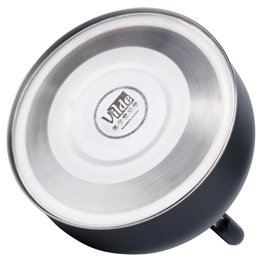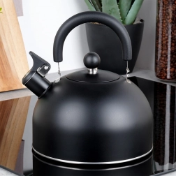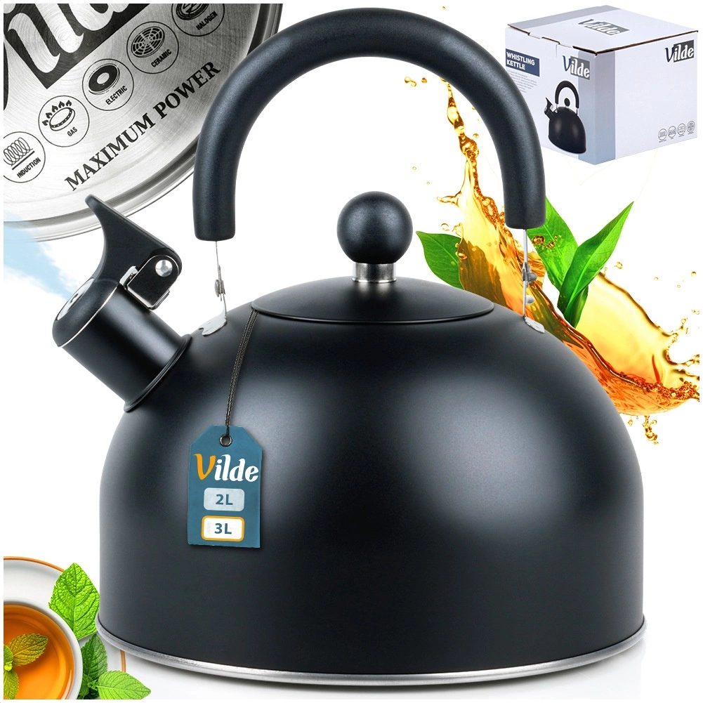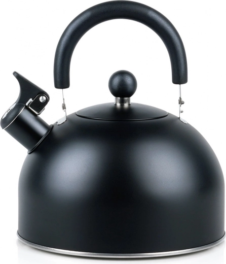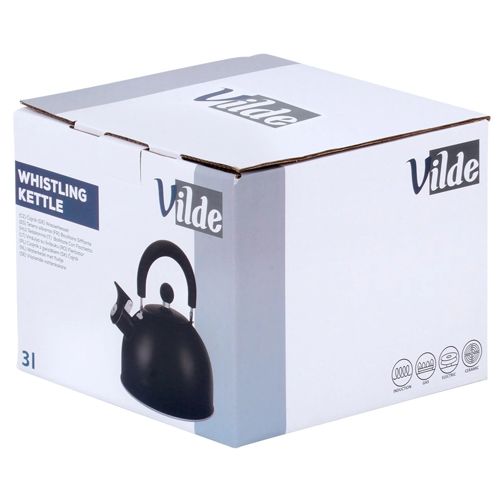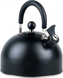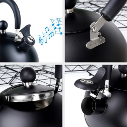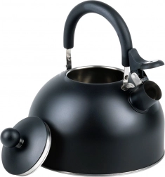 Stijlvolle zwarte roestvrijstalen fluitketel met een inhoud van 3 l (bruikbare inhoud 2,4 l), voorzien van een comfortabel, inklapbaar handvat en een fluitje. De akuthermische bodem zorgt voor snel opwarmen, zelfs bij laag vermogen, en energiebesparing. Geschikt voor gas-, elektrische, keramische en inductie kookplaten. Elegant mat design met eenvoudig onderhoud.