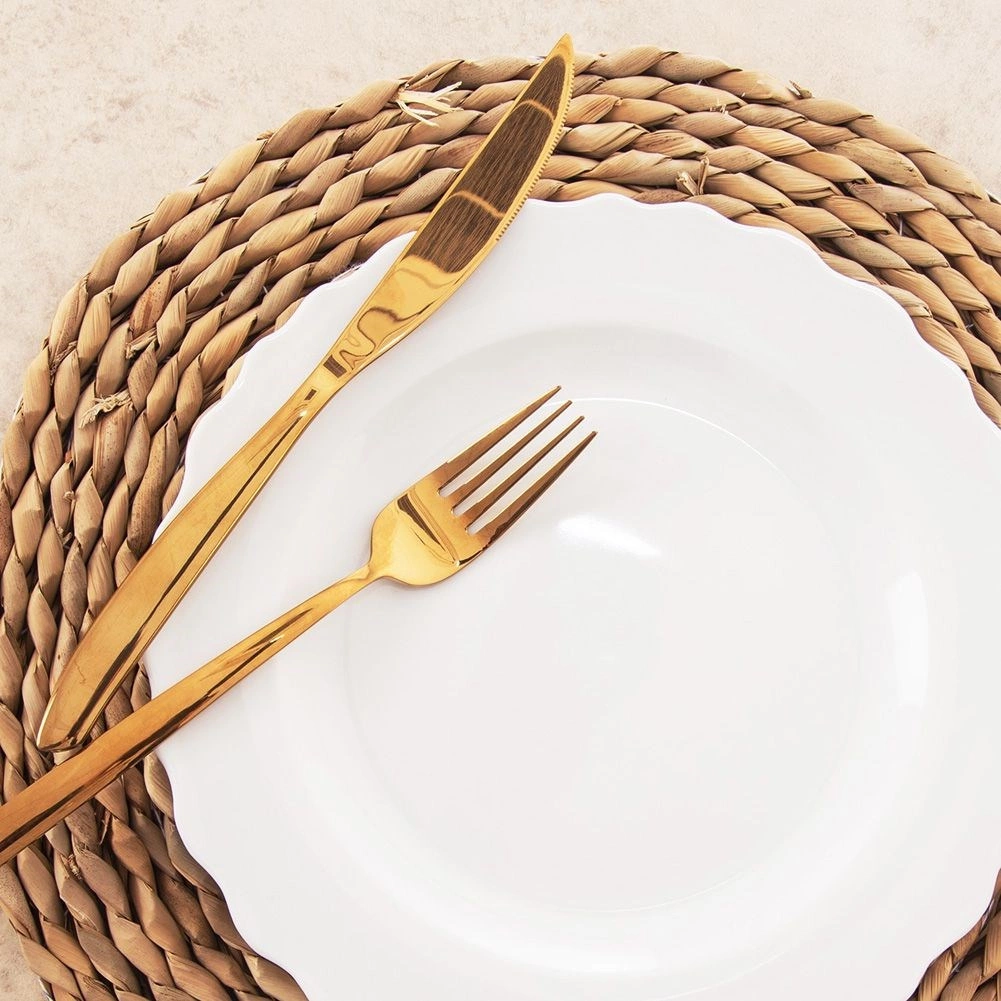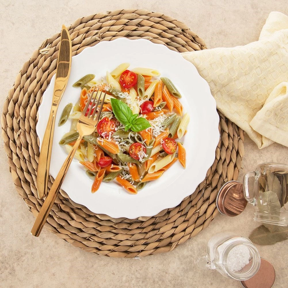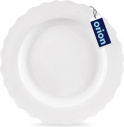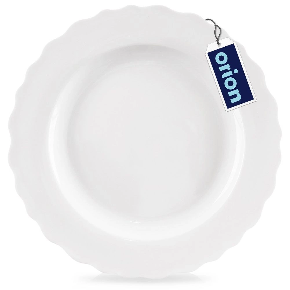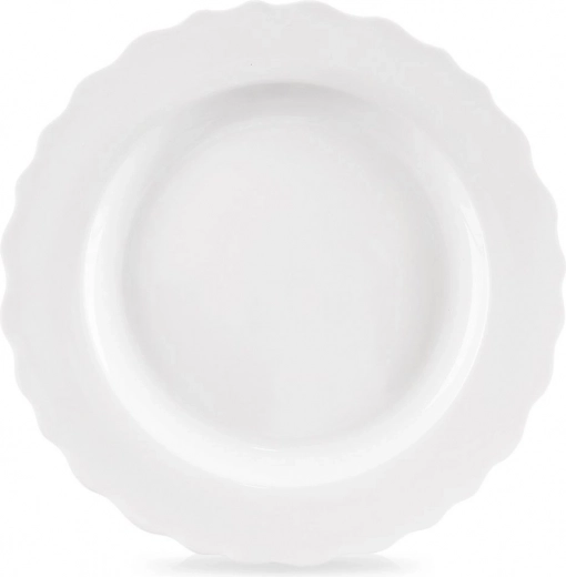 Een elegant plat bord van porselein met een diameter van 24,5 cm, geschikt voor dagelijks serveren en feestelijke gelegenheden. Het heeft een klassiek wit design, een decoratieve gegolfde rand, is geschikt voor de vaatwasser en magnetronbestendig, en dankzij de hoogwaardige porseleinen glazuur gaat het jarenlang mee.