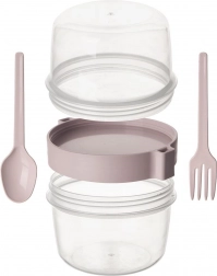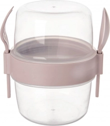 Praktische tweelaagse yoghurtbeker met mueslikom van 370 ml, ideaal voor onderweg, naar het werk en naar school. Dankzij het lekdichte deksel, het aparte compartiment voor toppings en de meegeleverde lepel en vork heb je je snack altijd klaar en vers. Gemaakt van duurzame BPA-vrije kunststof, geschikt voor de vaatwasser en zonder deksel ook voor de magnetron.