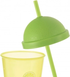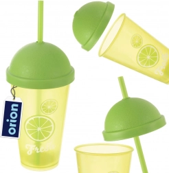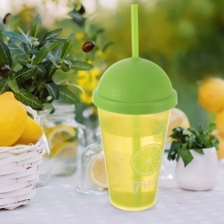 Stijlvolle beker met een inhoud van 450 ml met een vergrendelbare koepelvormige deksel en een herbruikbaar rietje. Licht en duurzaam design in het groen met een citrusdecor, ideaal voor koude dranken thuis en buiten, voor picknicks of tuinfeesten. Het deksel beperkt morsen en voorkomt het binnendringen van insecten, het rietje is zo ontworpen dat het niet uitvalt.