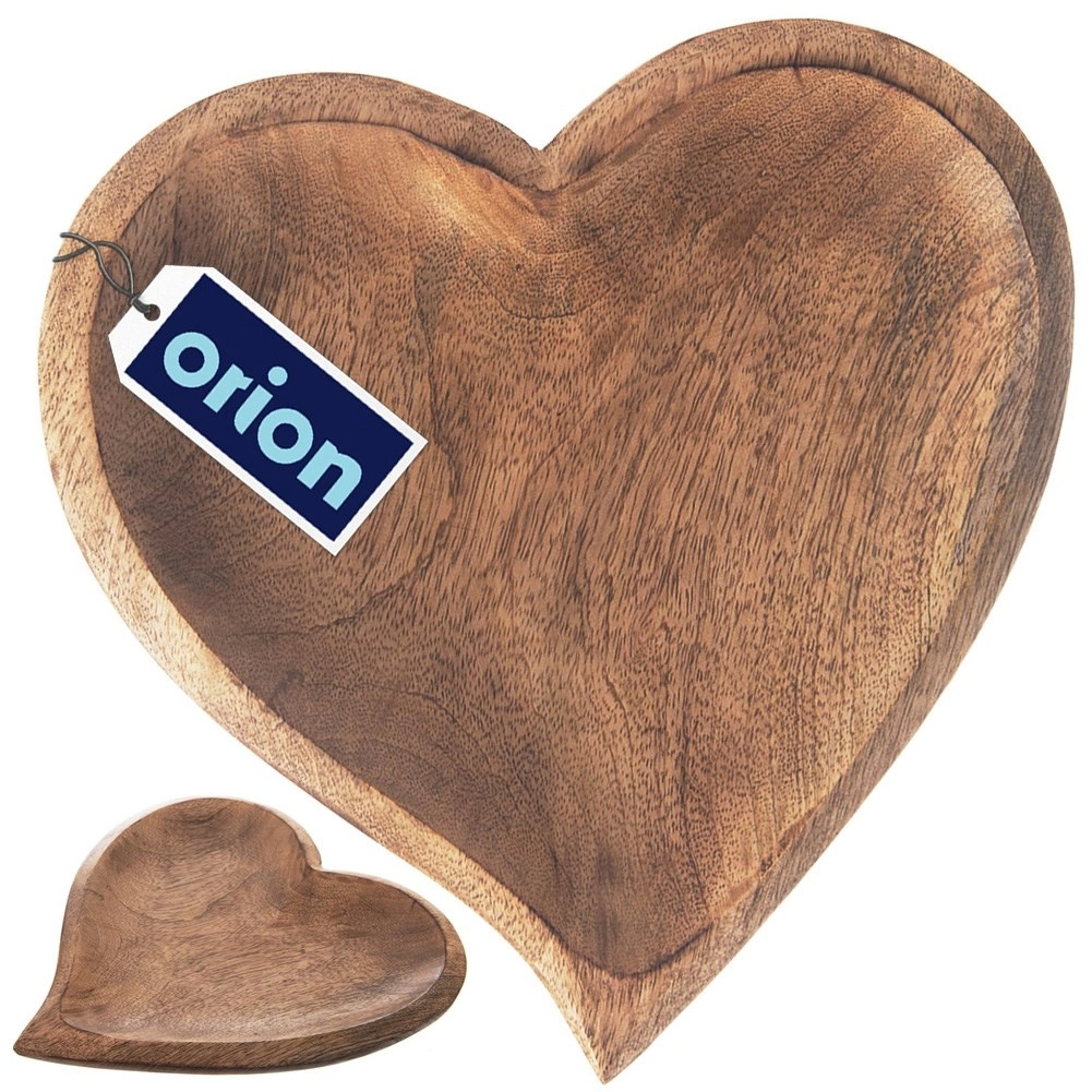 Stijlvolle houten serveerschaal in hartvorm van exotisch mangohout voor elegant serveren van hapjes. Met de hand uit één stuk hout gesneden, met een natuurlijke nerf, vochtbestendig en neemt geen geuren op. Ideaal voor nootjes, olijven, gedroogd fruit en kleine desserts – perfect voor thuis en in de horeca.