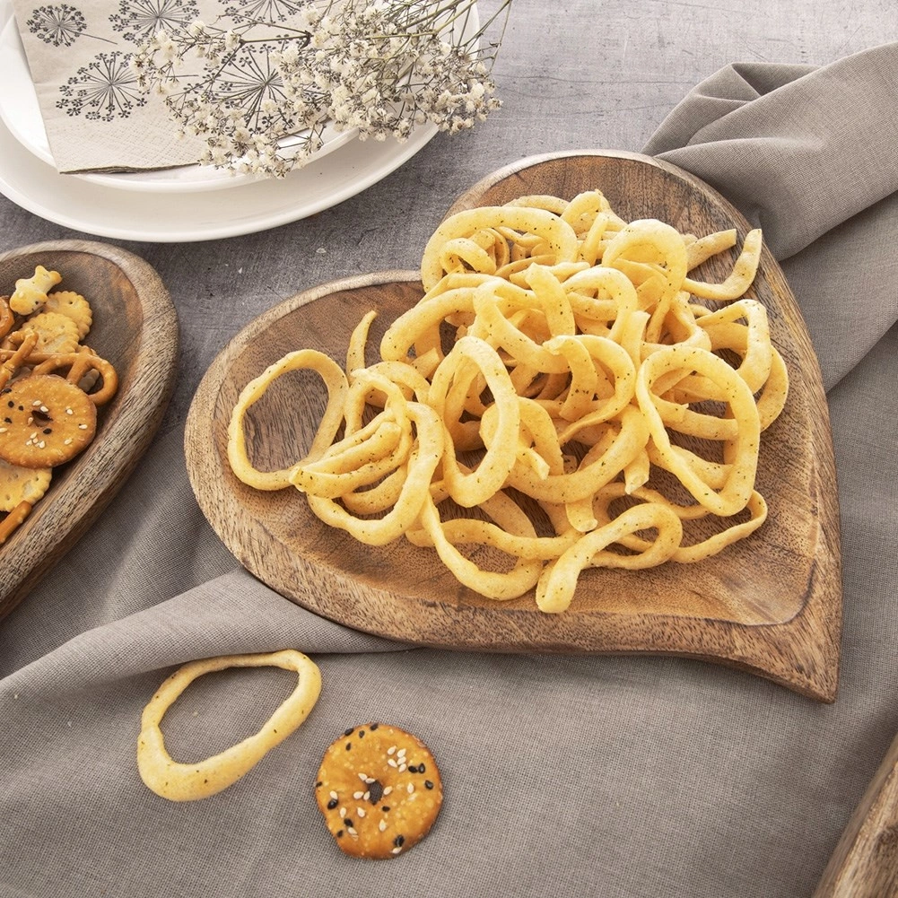 Ontdek de charme van natuurlijk serveren met deze handgemaakte schaal van mangohout. De hartvorm, afgeronde gladde randen en natuurlijke houtnerf geven elke tafel een warme, moderne uitstraling. Dankzij de verhoogde rand blijven hapjes netjes op hun plek en prachtig gepresenteerd.