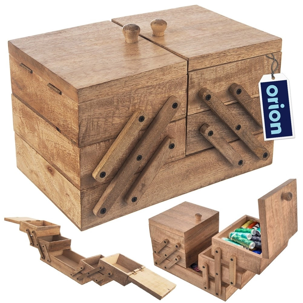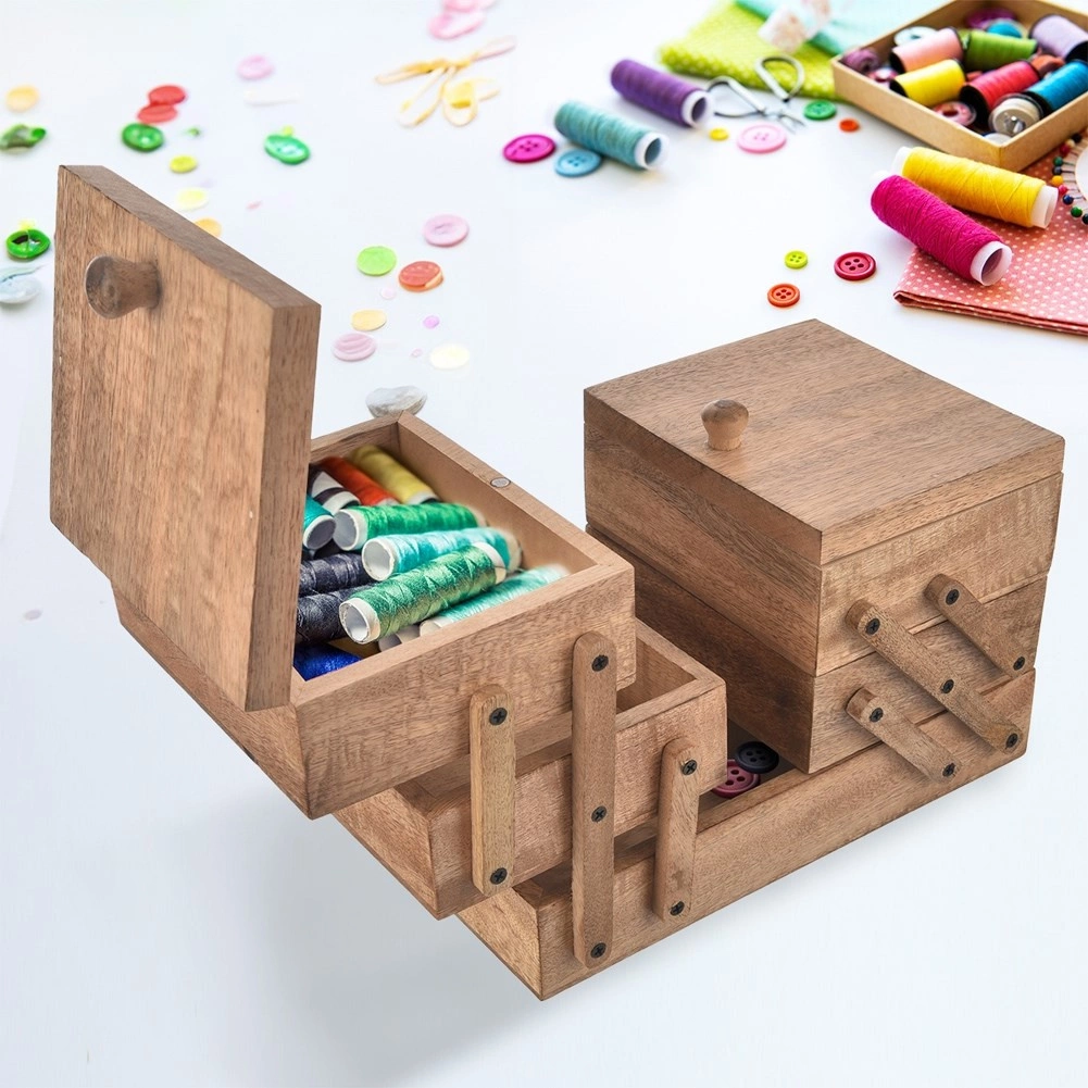 Het zorgvuldig afgewerkte hout is handgemaakt, vochtbestendig en vormvast. Twee bovenkleppen met houten knoppen zorgen voor snel en comfortabel openen. Binnenin vind je 5 praktische vakken – vier vierkante aan de zijkanten en één grote rechthoekige onderin – ideaal voor het segmenteren van naaibenodigdheden, kralen of klein gereedschap.