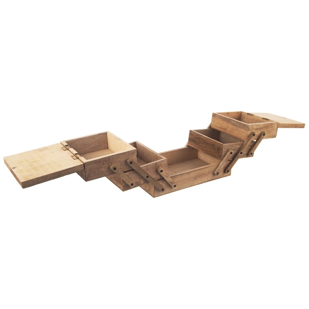 Dit houten naaietui van exotisch mangohout houdt je garen, naalden en kleine naaibenodigdheden perfect geordend. Dankzij de schaarmechaniek klapt het soepel uit tot 71 cm lengte en krijg je snel overzicht over de inhoud. De natuurlijke tint van mangohout geeft je creatieve hoek een elegante, natuurlijke uitstraling.