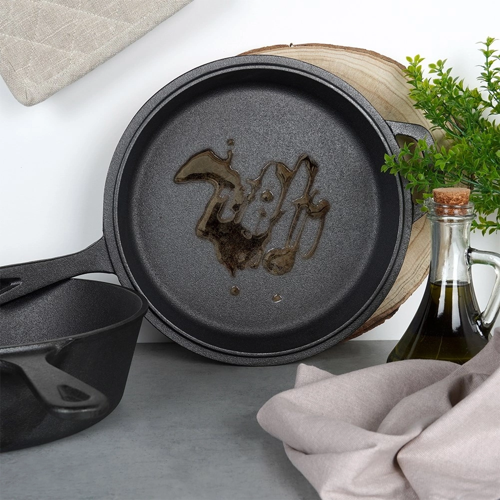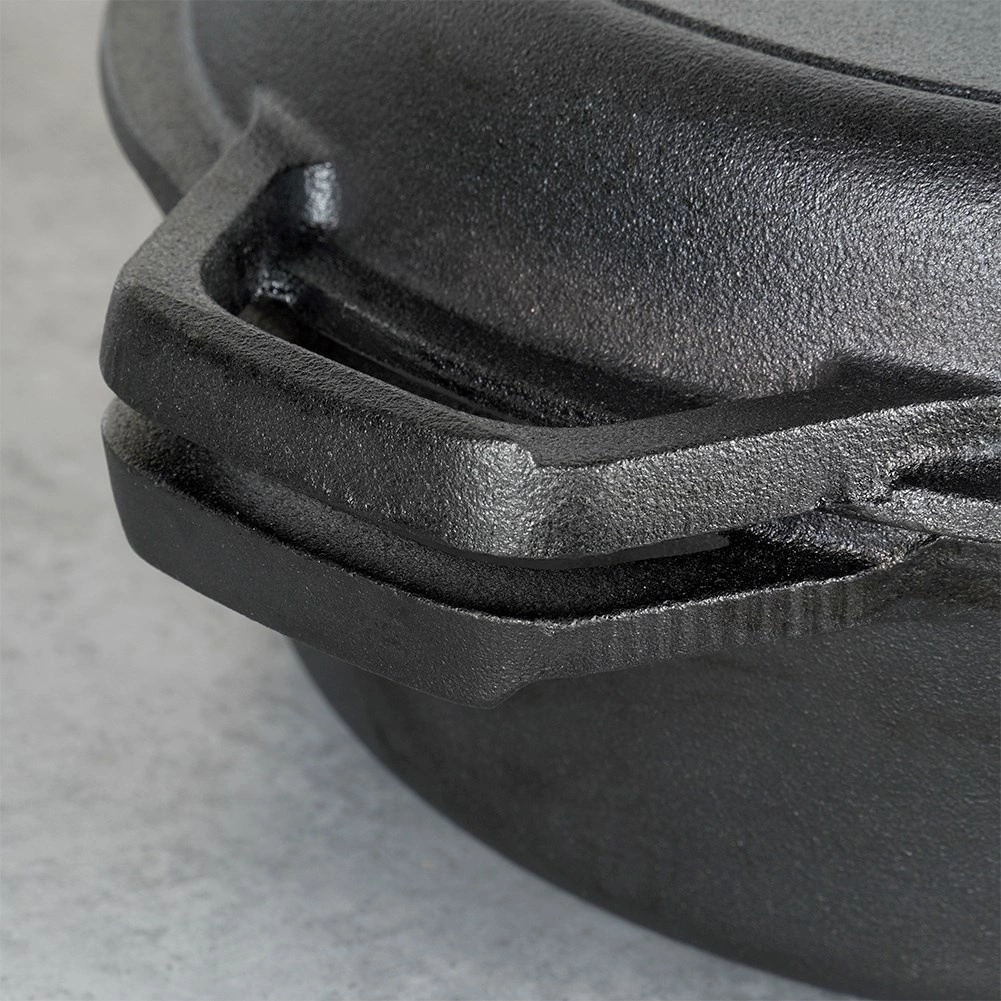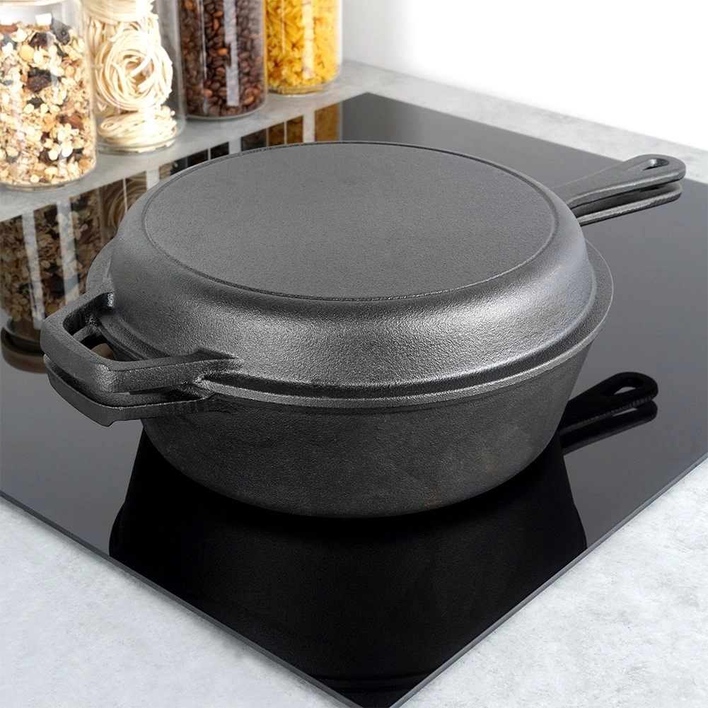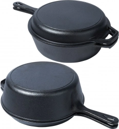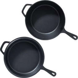 Robuste set van gietijzer voor veelzijdig koken: een diepe pan en een ondiepe koekenpan die perfect op elkaar aansluiten – de koekenpan kan als deksel dienen. Gietijzer zorgt voor egale warmteverdeling, lange warmteopslag en is ideaal om te bakken, braden en stoven op het fornuis, in de oven en boven open vuur. De duurzame constructie met dubbele grepen en compatibiliteit met gas, elektrisch, keramisch en inductie maakt van deze set een betrouwbare partner voor elke keuken en voor kamperen.