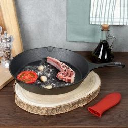 Deze volledig gietijzeren pan in het zwart is ideaal om te bakken, stoven en braden. Gietijzer warmt gelijkmatig op en houdt de hoge temperatuur lang vast, waardoor steaks, groenten en aardappelen een perfecte structuur krijgen en langer warm blijven. De rode siliconen hoes zorgt voor een veilige grip zonder risico op verbranding.