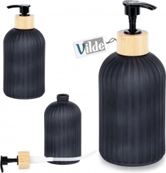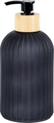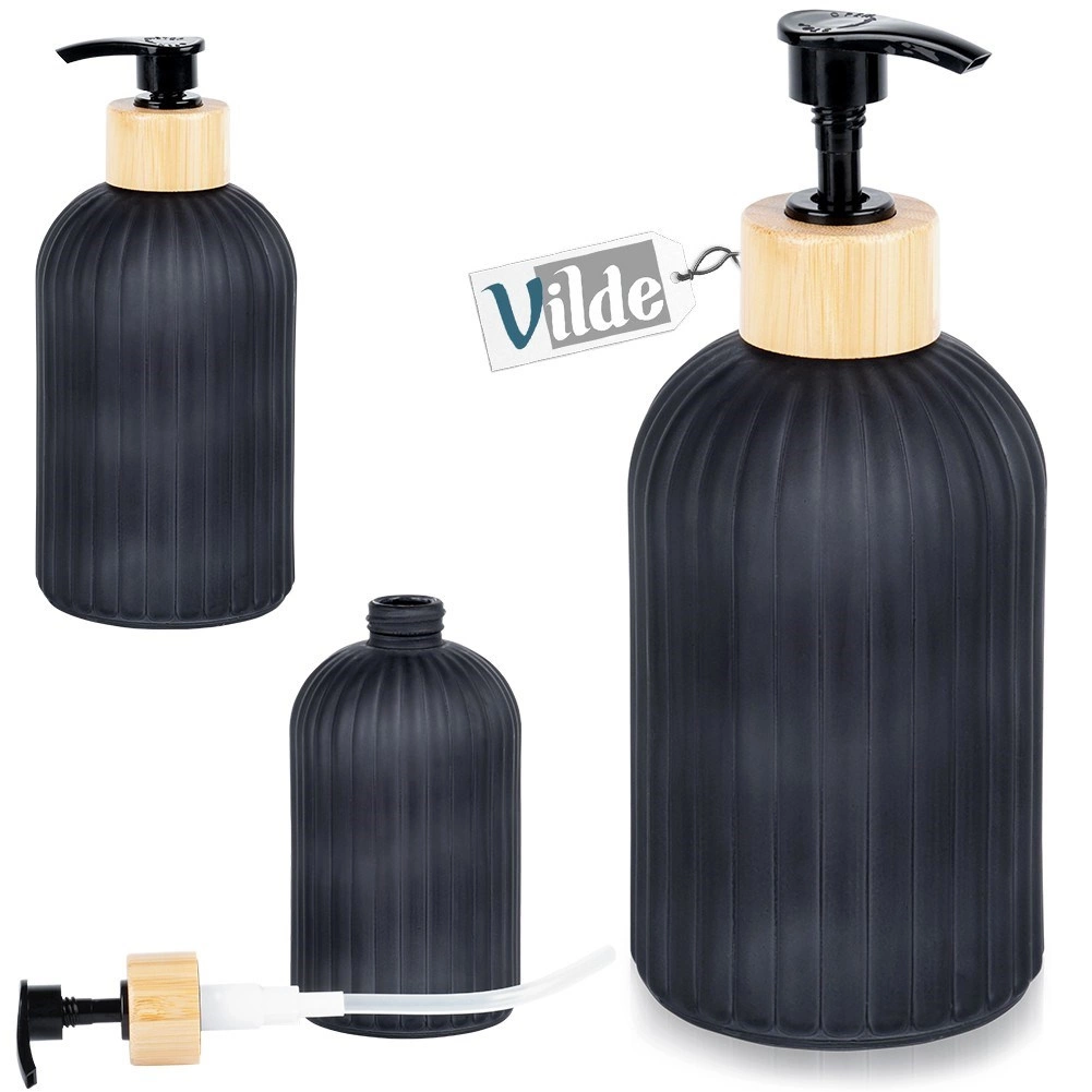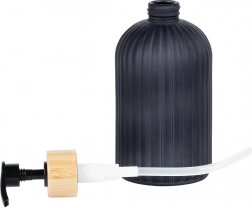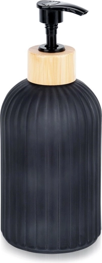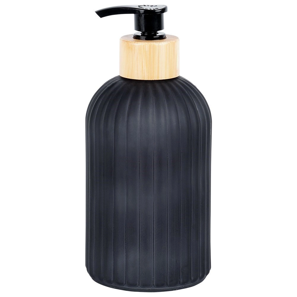 Elegante glazen zeepdispenser met een inhoud van 400 ml in matte zwarte uitvoering, voorzien van een natuurlijke bamboeringen en een zwarte pomp. Dankzij de antislip geribbelde structuur ligt hij goed in de hand, is hij eenvoudig bij te vullen en siert hij met zijn moderne, minimalistische design zowel de badkamer als de keuken. De praktische vergrendelbare pomp vergemakkelijkt transport en voorkomt lekkage.