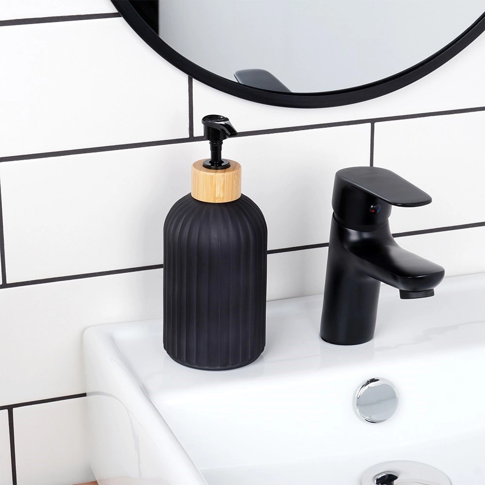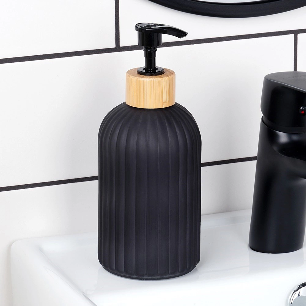 Stijlvolle dispenser voor vloeibare zeep of afwasmiddel, die duurzaam glas combineert met een matte zwarte afwerking en een natuurlijk bamboe-accent. De verticale ribbels geven een modern uiterlijk en verbeteren tegelijk de grip. Past in zowel badkamer als keuken en voegt door de strakke vorm moeiteloos in moderne interieurs.