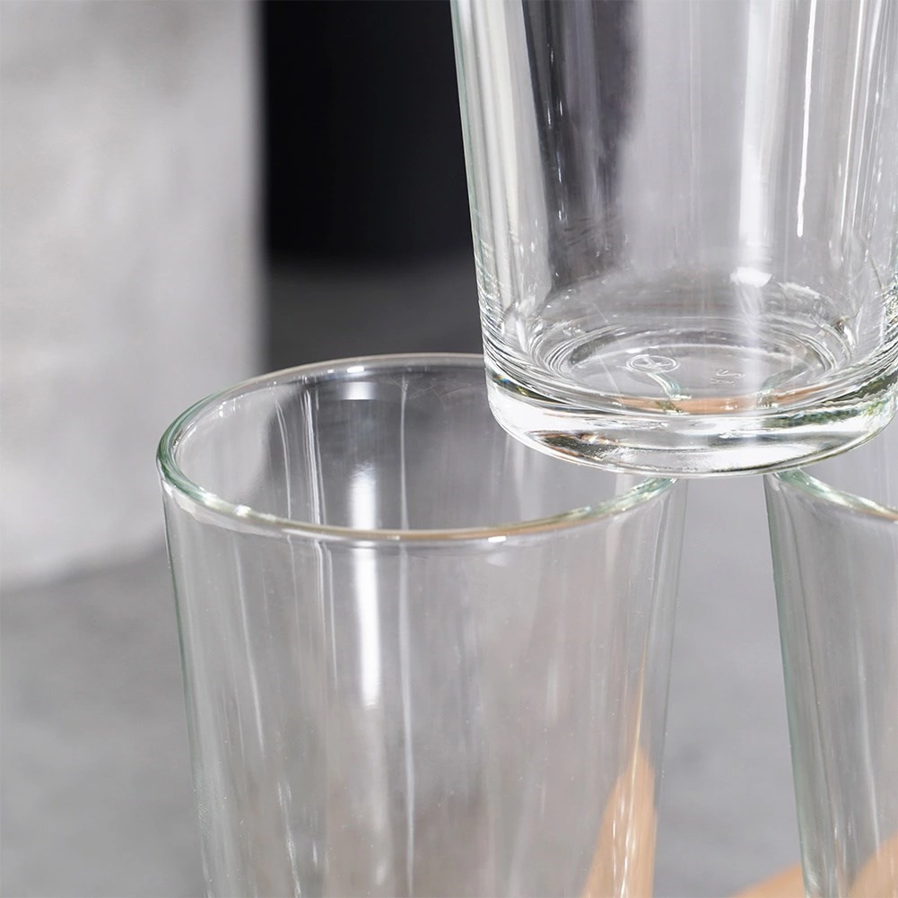 Deze universele set glazen is ideaal voor water, limonades, sappen, ijsthee en mixdranken. De eenvoudige, tijdloze vorm past bij elke tafel en combineert perfect met andere serviesstukken. De glazen zijn ca. 10 cm hoog en hebben een diameter van 7 cm, waardoor ze prettig in de hand liggen en gemakkelijk op te bergen zijn.