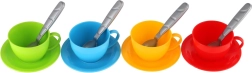 Theepot, 4 kopjes, 4 schoteltjes, 4 lepeltjes (kleurencombinatie)