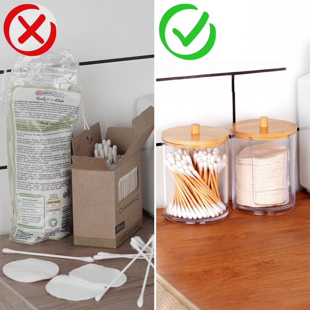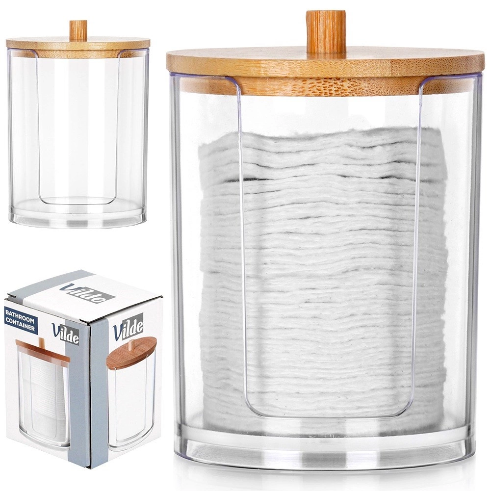 Stijlvolle houder voor watjes van helder acryl met een bamboe deksel houdt je watjes schoon en binnen handbereik. Dankzij de praktische dispenser trek je eenvoudig één watje uit zonder de hele pot te openen, de transparante wanden tonen de resterende hoeveelheid en het moderne, minimalistische design past in elke badkamer.