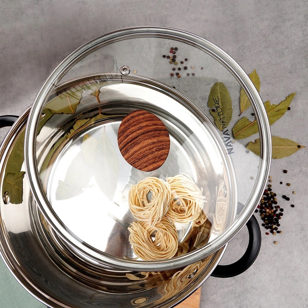 De praktische glazen deksel NAVA Nature met een diameter van 24 cm is de ideale aanvulling op pannen, koekenpannen en steelpannen van dezelfde grootte. Het hittebestendige, transparante glas maakt controle tijdens het koken mogelijk zonder op te tillen, wat energie bespaart en warmte en vocht binnen de pan houdt.