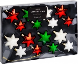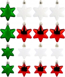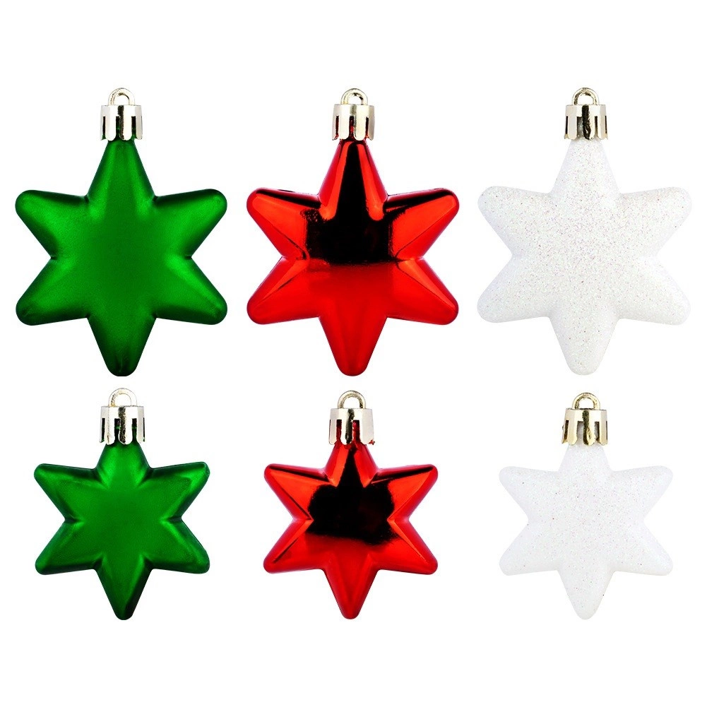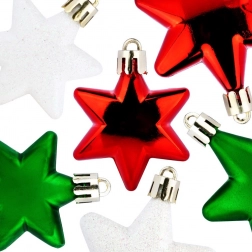 Stijlvolle set kerstornamenten in de vorm van sterren in de kleuren rood, groen en wit, die elke boom een klassieke glans en een betoverende sfeer geven. De ornamenten zijn onbreekbaar, licht en veilig voor huishoudens met kinderen of huisdieren. Een mix van glanzende, matte en glitterende afwerkingen in diameters van 6 en 5 cm biedt perfecte variatie voor kerstboom, kransen en guirlandes.