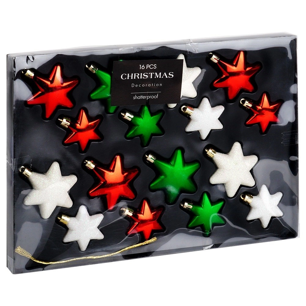 Verrijk je feestdecor met elegante sterretjes die sterk doen denken aan glazen ornamenten, maar dankzij de duurzame kunststof veilig en onbreekbaar zijn. De set van 16 stuks in een harmonische combinatie van rood, groen en wit (inclusief glittervarianten) geeft je interieur stijl en warme kerstsfeer.