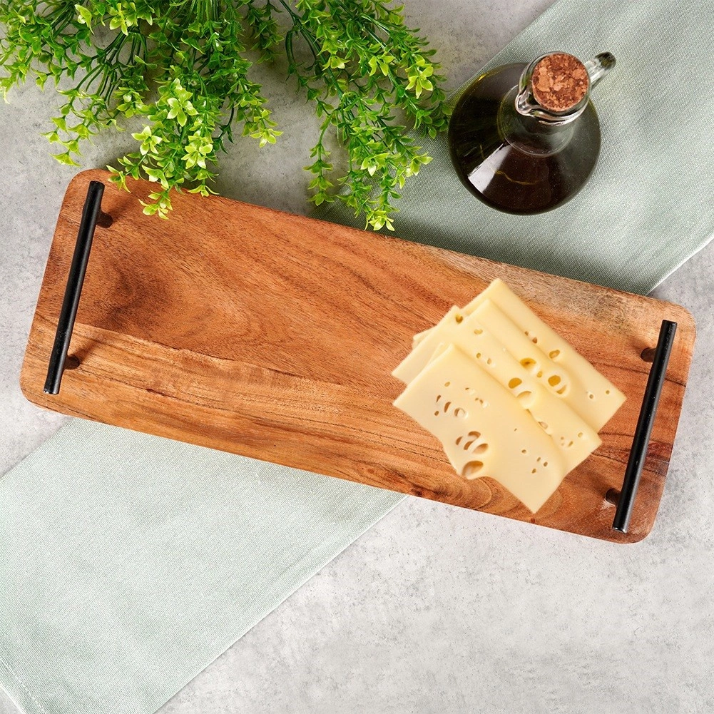 Elegante serveerplank van acaciahout met zwarte metalen handgrepen voor gemakkelijk dragen. Ideaal voor kazen, voorgerechten, desserts en ontbijt, perfect voor thuis en in de horeca. Natuurlijk hout in industriële stijl geeft je tafel een unieke uitstraling. Afmetingen: 40 × 15,5 × 5 cm.
