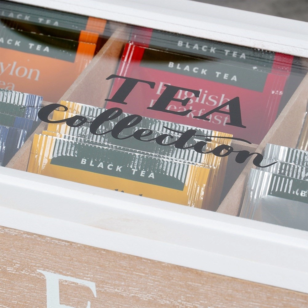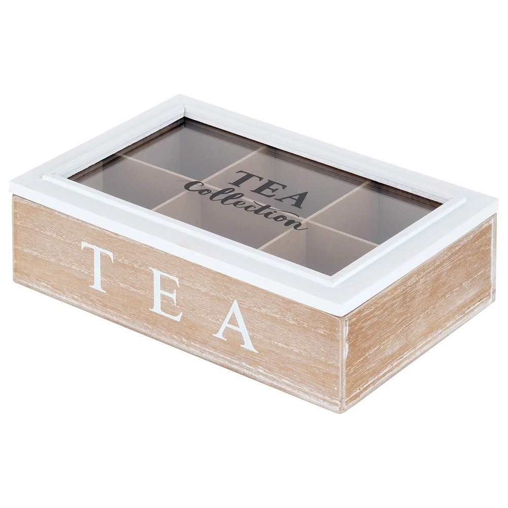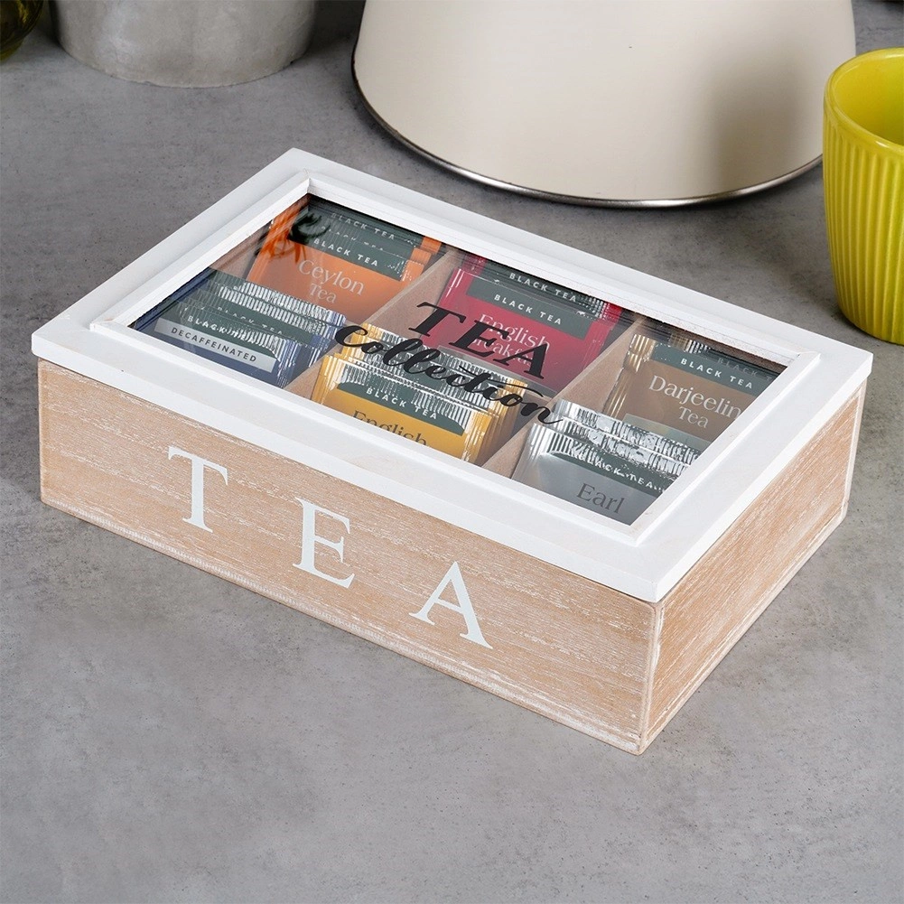 Stijlvolle houten theebox met 6 vakken houdt je favoriete zakjes netjes geordend. Het glazen deksel maakt snelle keuze mogelijk zonder te openen; de rustieke witte afwerking en de opschriften TEA en TEA Collection geven elke keuken elegantie. Afmetingen box 24,5 × 16 × 7 cm, vakken 7,5 × 7 × 6 cm.