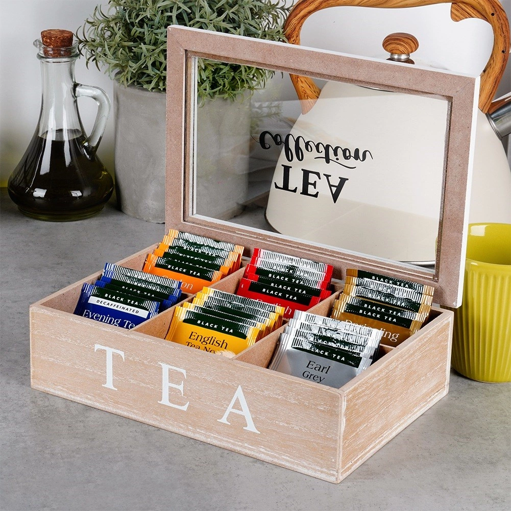 Bewaar je thee overzichtelijk en met plezier. Deze kwaliteitsorganizer van MDF met rustieke witte afwerking biedt zes afzonderlijke vakken voor diverse smaken, zodat aroma en versheid langer behouden blijven. Het glazen deksel laat je de inhoud meteen zien, zonder onnodig openen.