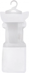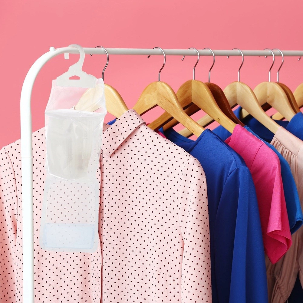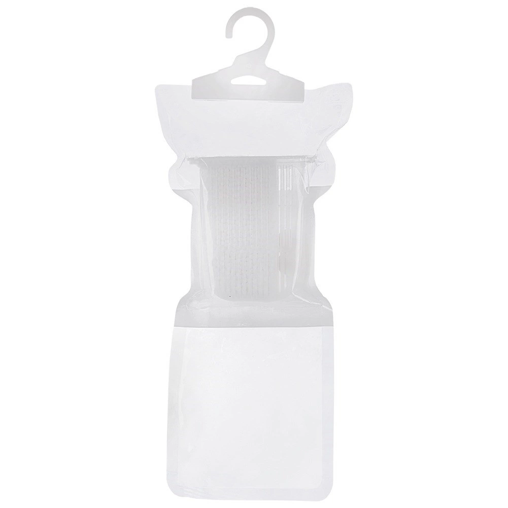Dankzij de praktische haak hang je hem eenvoudig aan een kledingroede of wandhaak. De absorberende CaCl₂-korrels binden vocht uit de lucht en zetten dit om in water dat zich in het onderste deel van het zakje verzamelt. Na het vollopen dient het product te worden vervangen.
