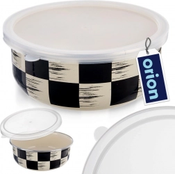 Praktische geëmailleerde kom met deksel met een inhoud van 800 ml in retrostijl, ideaal voor bewaren, serveren en meenemen van gerechten en ook voor opwarmen op het fornuis. Afmetingen 15,5 × 6 cm, elegant zwart‑beige schaakbordpatroon en veilig email geschikt voor allergiepatiënten. Vaatwasserbestendig en geschikt voor alle soorten fornuizen, inclusief inductie.