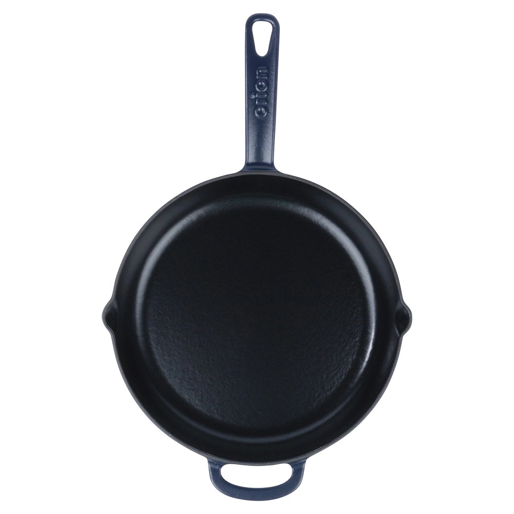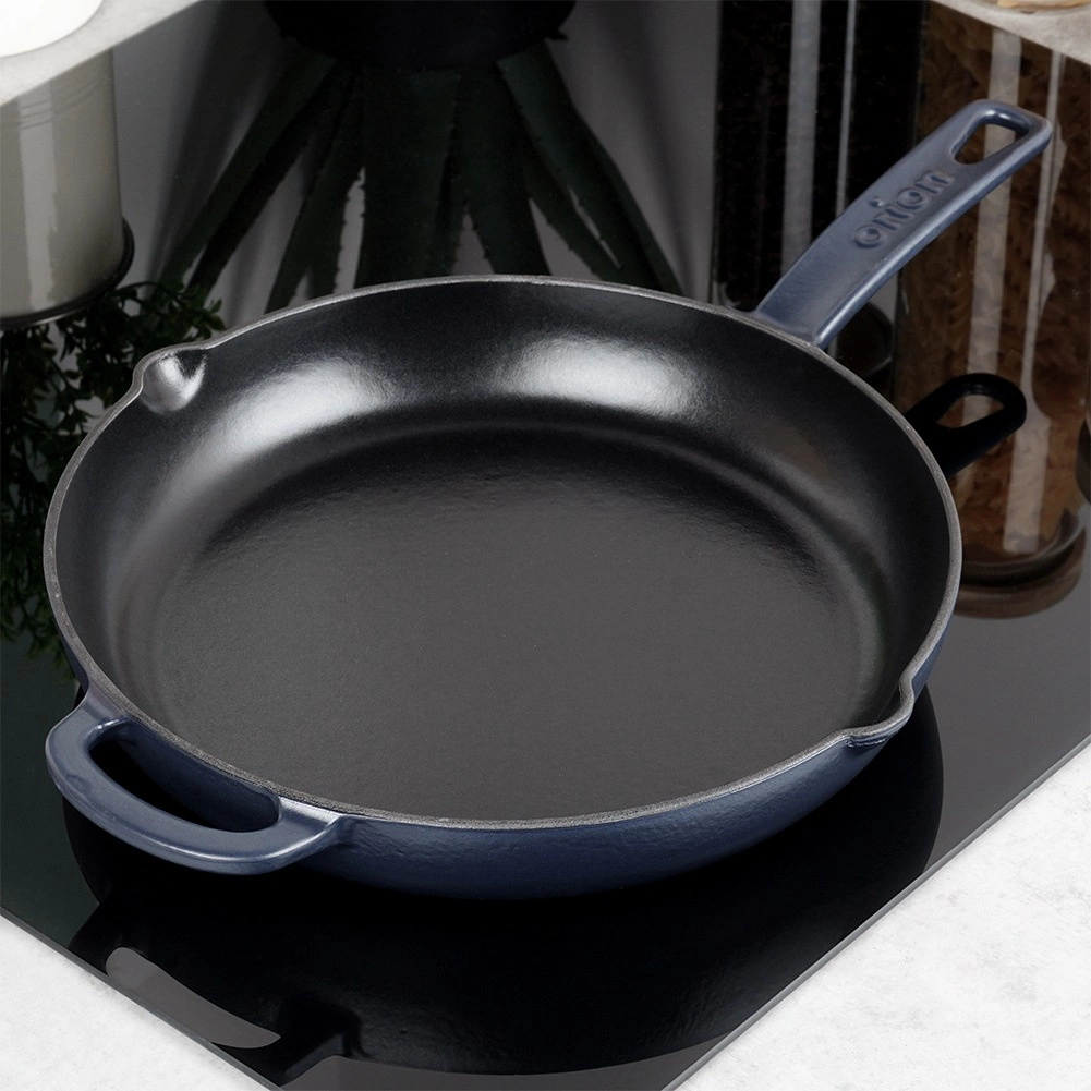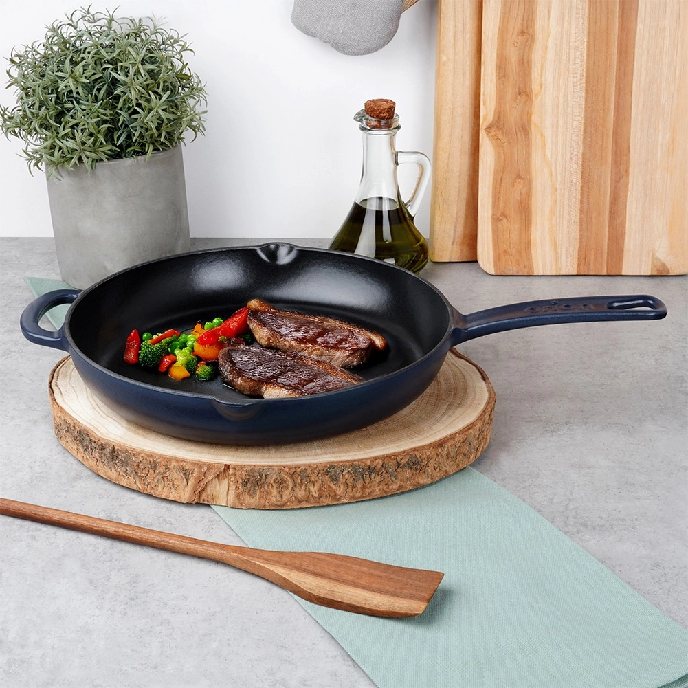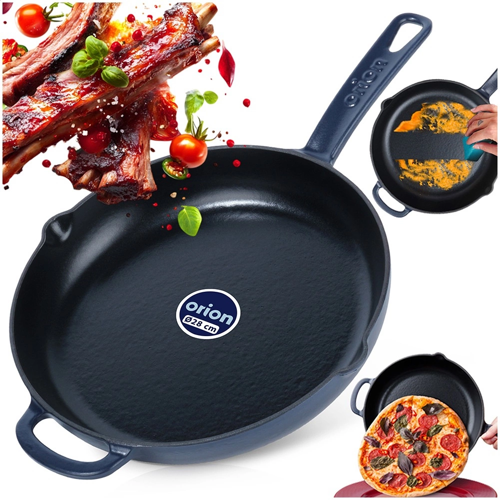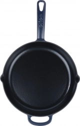 Robuuste gietijzeren pan met een diameter van 28 cm, met een zwarte geëmailleerde binnenkant en een blauwe buitenkant. Biedt gelijke warmteverdeling, lange warmteopslag en brede compatibiliteit met alle soorten kookplaten, inclusief inductie. Dankzij de twee schenktuiten en het dubbele handvat is hij ideaal om te bakken, braden en direct aan tafel te serveren.