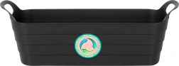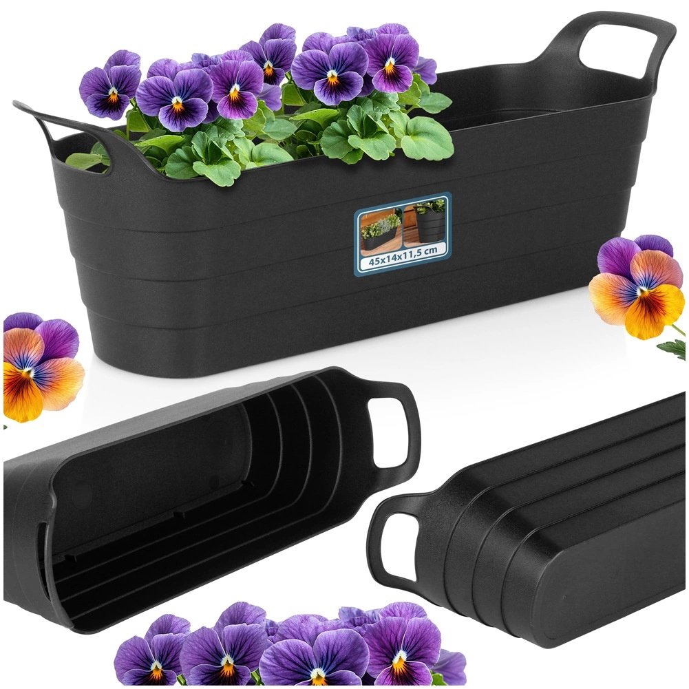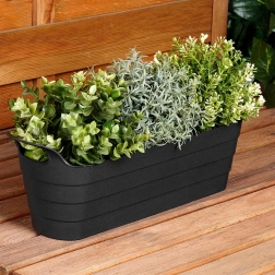 Stijlvolle zwarte bloembak van 44,5 cm met geïntegreerde handgrepen, ideaal voor balkons, terrassen en tuinen. Gemaakt van duurzame gerecyclede kunststof, met een langwerpige vorm voor een opvallende beplanting van kruiden en bloemen, en dankzij de weerbestendigheid het hele jaar door buiten te gebruiken. Lichtgewicht constructie en praktische handgrepen maken verplaatsen en onderhoud eenvoudig.