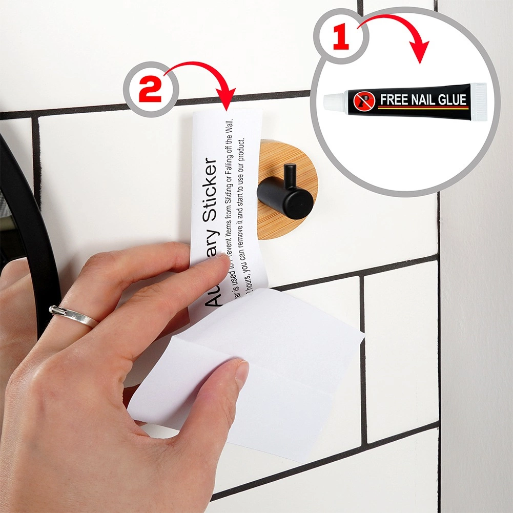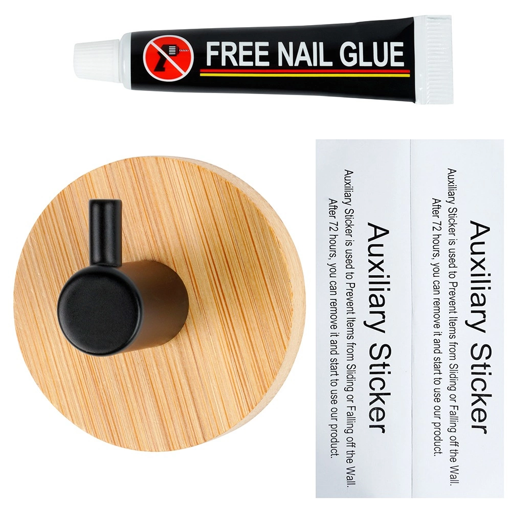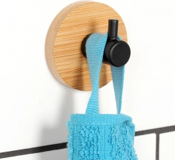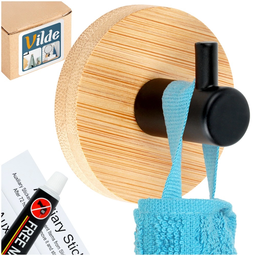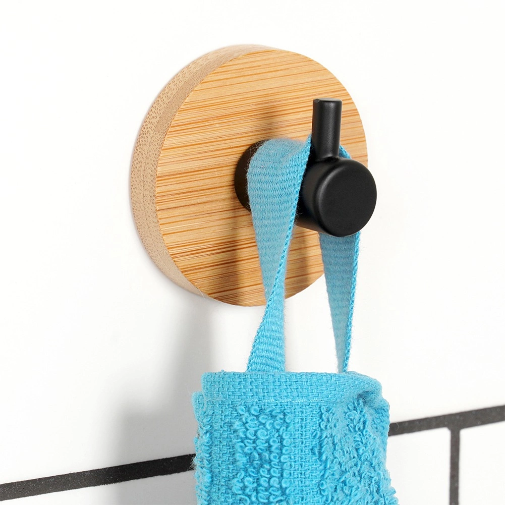 Stijlvolle wandhaak met bamboe basis en zwarte metalen pin voor dagelijks gebruik in badkamer, keuken en hal. Montage zonder boren met lijm en zelfklevende stickers zorgt voor stevige en duurzame bevestiging. Compacte afmetingen 5 × 3,5 cm, modern design en universele inzet voor handdoeken, doeken, badjassen of accessoires.