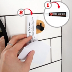 Bevestig de haak met sterke lijm en hulpstickers. Een schone, gladde ondergrond is voldoende en na 72 uur is de verbinding maximaal sterk.