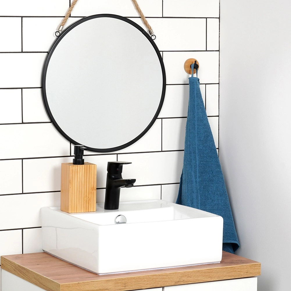 De ronde bamboe basis in combinatie met de zwarte metalen pin geeft je interieur een moderne, elegante touch en past perfect in zowel badkamer als keuken.