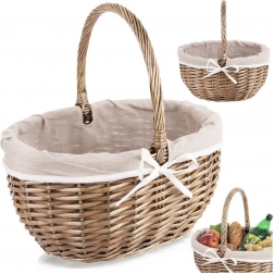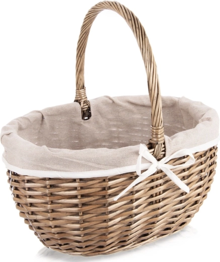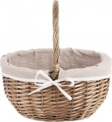 De voering is beige met een decoratieve witte bies en strik. Je kunt hem eenvoudig verwijderen en wassen tot 40 °C, zodat de mand gemakkelijk schoon te houden is. Na het verwijderen van de voering doet hij ook dienst als praktische mand voor het plukken van paddenstoelen.