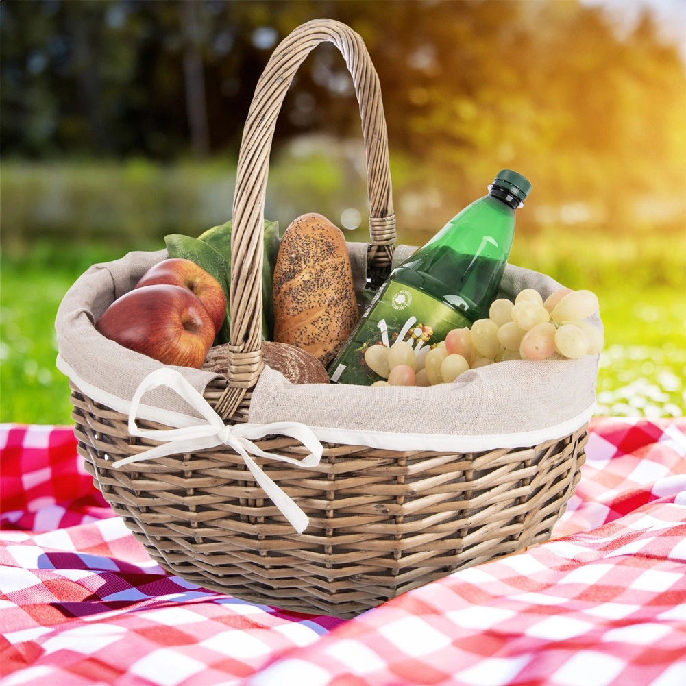 Elegante rieten picknickmand met praktisch handvat en uitneembare stoffen voering, met stevig handgevlochten natuurlijk riet, veelzijdig gebruik en eenvoudig onderhoud. Ideaal voor picknick, boodschappen, opbergen en als paddenstoelenmand na het verwijderen van de voering.