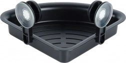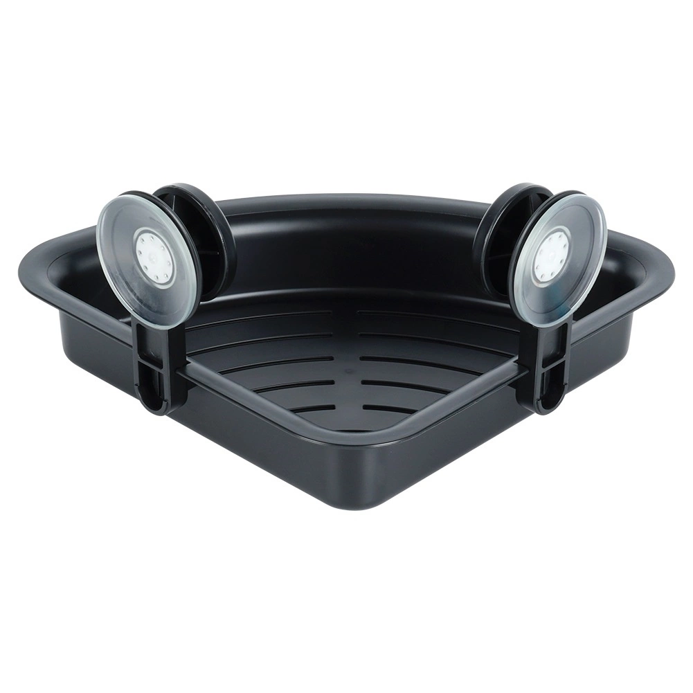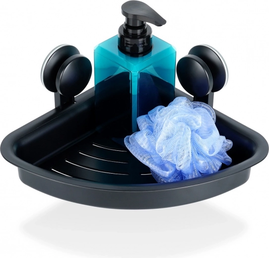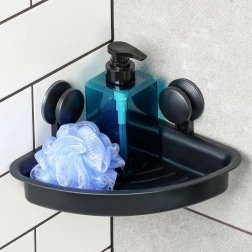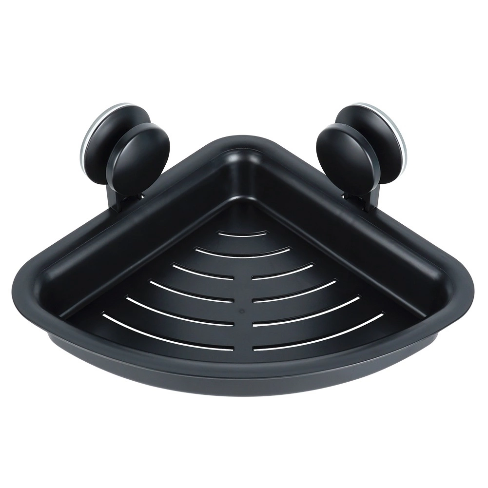 Praktische hoekdoucheplank met montage via zuignappen voor een stabiele opbergruimte zonder boren. In matzwart, met afvoergaten voor snel drogen en eenvoudige reiniging. Ideaal voor douchegels, shampoos, zeep en sponzen op gladde oppervlakken zoals tegels of glas.