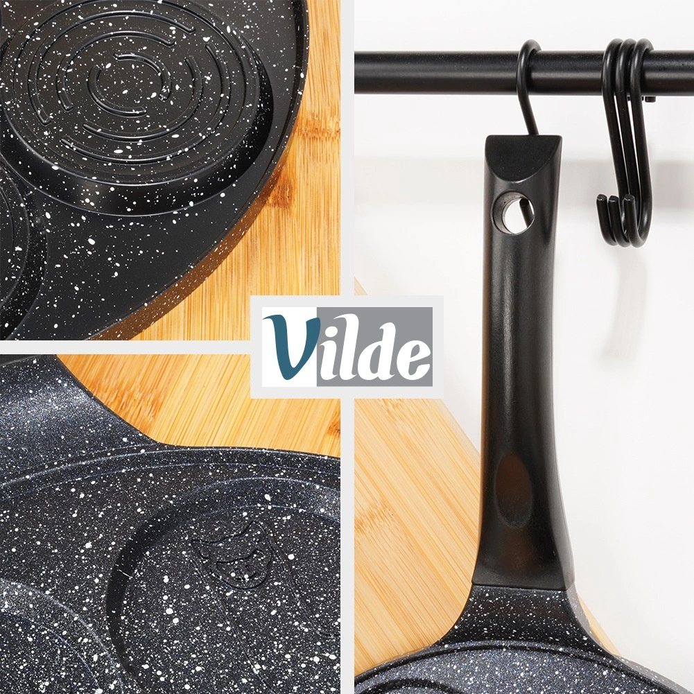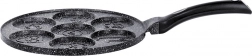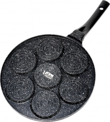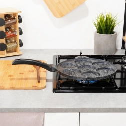 Praktische granieten pan voor eieren en pannenkoekjes met 7 ronde vormen met een diameter van 8 cm voor een perfect ronde vorm. Duurzame aluminium behuizing met een anti-aanbak granieten coating maakt koken met een minimum aan olie mogelijk. Ergonomische handgreep met ophangoog, gelijkmatige warmteverdeling voor snel en energiezuinig bakken. Geschikt voor gas, elektrisch en keramisch en vaatwasmachinebestendig.