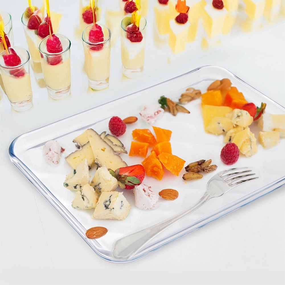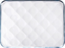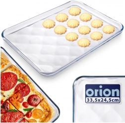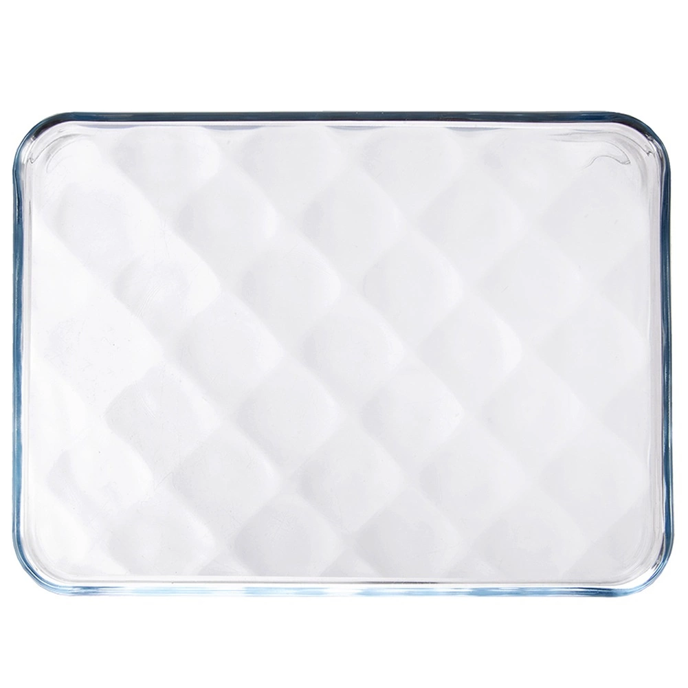 Universele glazen schaal van borosilicaatglas met afmetingen 33,5 × 24,5 × 2 cm voor bakken, opwarmen en serveren. Dankzij het subtiele reliëf op de bodem is ze elegant en praktisch – het zorgt voor een betere luchtcirculatie en vermindert aanbranden. Geschikt voor oven, magnetron, vaatwasser en vriezer (−40 °C tot +300 °C).