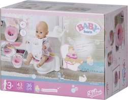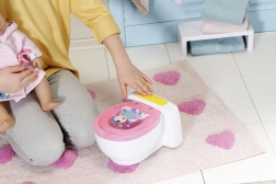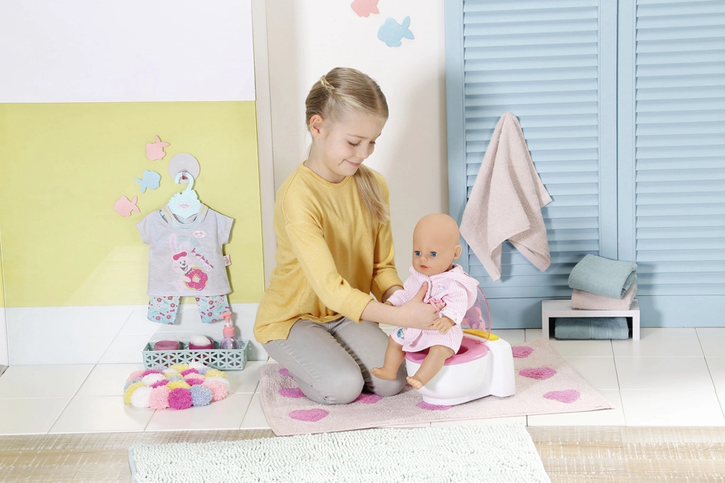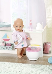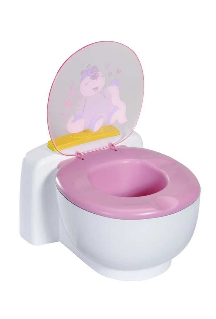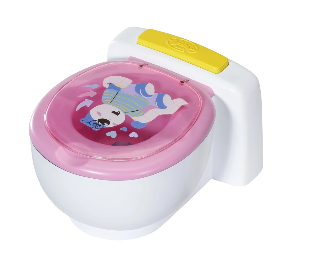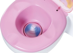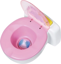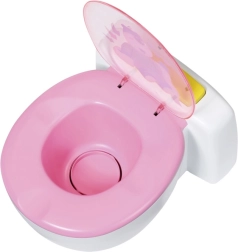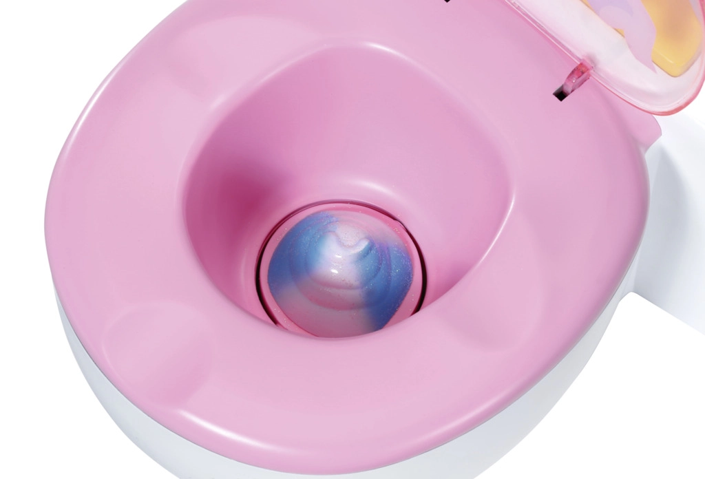 BABY born gaat al naar het toilet! Zodra ze op haar witte troon met roze zitje gaat zitten, hoor je plasgeluiden, applaus en vrolijk gelach. BABY born kan ook poepen. In dat geval verschijnt er kleurrijke, glinsterende poep in de kom. Snel, het is tijd om door te trekken! Wanneer je op de spoelknop drukt, verdwijnt de poep en hoor je doorspoelgeluiden. • Originele accessoire voor BABY born-poppen. • Voor fantasierijk, gevarieerd en langdurig speelplezier. • Werkt op batterijen (niet inbegrepen). BABY born Magisch toilet met geluidseffecten en verrassing.