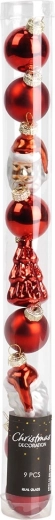 Elegante set rode kerstversieringen die je decoratie een klassieke glans en betoverende sfeer geeft. Bevat 9 stuks onbreekbare versieringen van hoogwaardige kunststof – 6× ballen met een diameter van 3 cm, 2× SANTA-figuurtje van 5 cm en 1× boompjesfiguurtje van 5 cm. De combinatie van glanzende en matte afwerking zorgt voor een indrukwekkende compositie en is veilig voor kinderen en huisdieren.