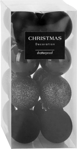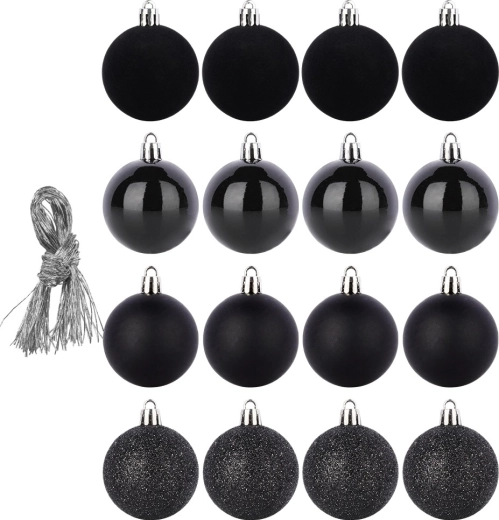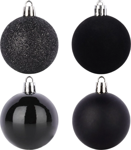 Creëer thuis een unieke feestelijke sfeer met een set hoogwaardige, onbreekbare ornamenten in elegante zwarte kleur. Dankzij de mix van afwerkingen – mat, glans, glitter en velours – krijgt uw kerstboom en andere decoraties een modern en indrukwekkend uiterlijk.