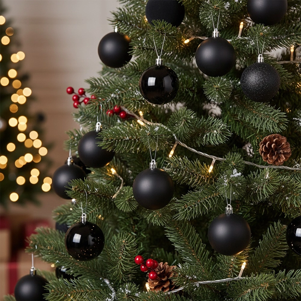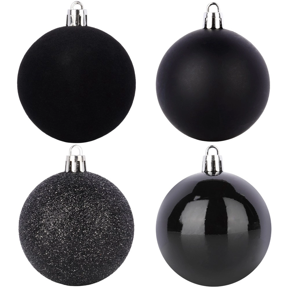 Elegante set zwarte kerstballen voor je kerstdecoratie. Bevat 16 stuks met een diameter van 8 cm in verschillende afwerkingen – mat, glans, glitter en fluweel. Dankzij het onbreekbare materiaal zijn ze veilig voor huishoudens met kinderen en huisdieren en geven ze de kerstboom een stijlvolle en moderne uitstraling.