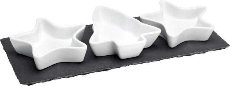 Stijlvolle set voor het serveren van lekkernijen, bestaande uit drie porseleinen schaaltjes in de vorm van een ster en een boompje en een rechthoekig leisteen dienblad. Ideaal voor noten, olijven, dip en andere kleine hapjes tijdens feestelijke bijeenkomsten. Elegant design, hoogwaardig porselein en praktische afmetingen zorgen voor comfortabel en effectief serveren.