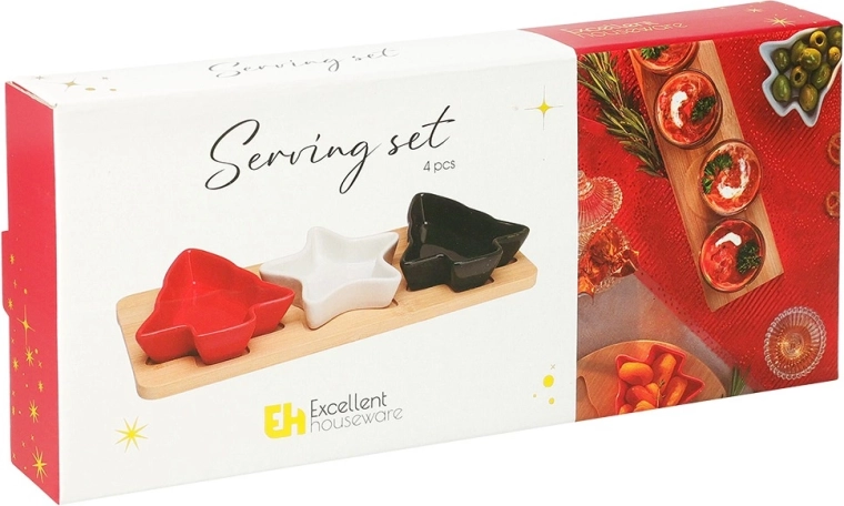 Stijlvolle 4-delige serveerset die de elegantie van porselein met natuurlijk bamboe combineert. Bevat drie schaaltjes in de vorm van een boompje en een ster en een stabiel langwerpig dienblad. Ideaal voor noten, olijven, dips en kleine hapjes tijdens feestelijke bijeenkomsten. De schaaltjes kunnen zonder dienblad in de vaatwasser.