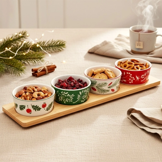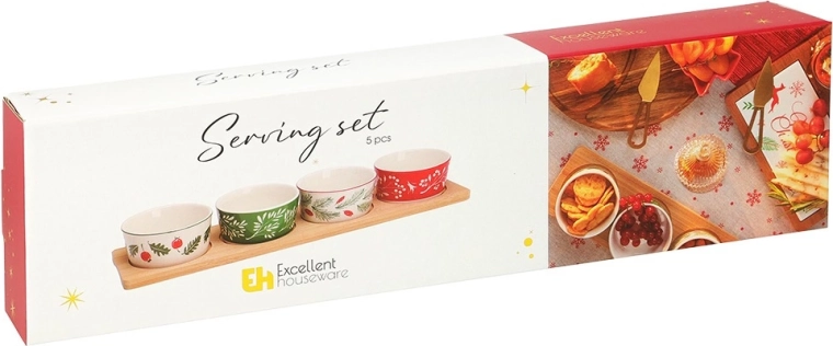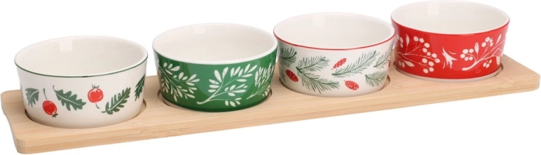 Stijlvolle serveerset met een bamboe dienblad en 4 porseleinen schaaltjes met kerstmotieven. Ideaal voor nootjes, olijven, dips en kleine hapjes tijdens feestelijke bijeenkomsten. Stabiele uitsparingen in het dienblad voorkomen dat de schaaltjes verschuiven; de porseleinen schaaltjes zijn vaatwasmachinebestendig. Afmetingen dienblad 38 × 10 × 4,5 cm, schaaltje 8,5 × 4 cm, inhoud 140 ml.
